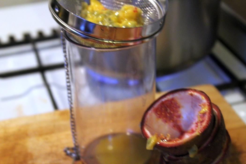 Den Inhalt der Passionsfrucht durch ein Sieb streichen.