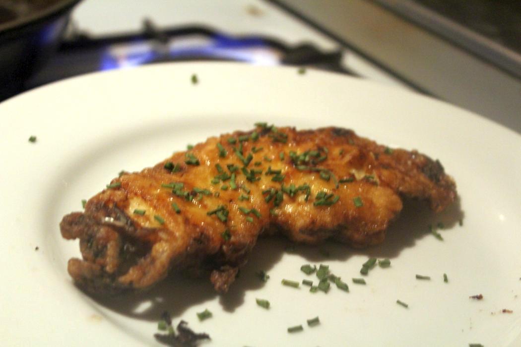 Ich habe nur einen kleinen Ansatz mit zwei kleinen Schnitzeln gemacht, um die Technik zu prüfen und ob das meiner Frau schmeckt. Die hat nämlich schon bei der Vorankündigung ein Schweppesgesicht gemacht, als ich von einer Eihülle gesprochen habe. Deswegen habe ich das Projekt bestimmt zwei Jahre vor mir hergeschoben. Mit Laien über Gerichte zu sprechen, die sie sich nicht vorstellen können, ist wirklich wie das Praktizieren ausgefallener Sexualtechniken. Den einen stellt man am besten kommentarlos den Teller vor die Nase und im anderen Fall ist eine Augenbinde und ein Knebel ganz hilfreich. Sonst kommt man zu nix. Wo waren wir? Ach ja, Zwiebel nackig machen.
