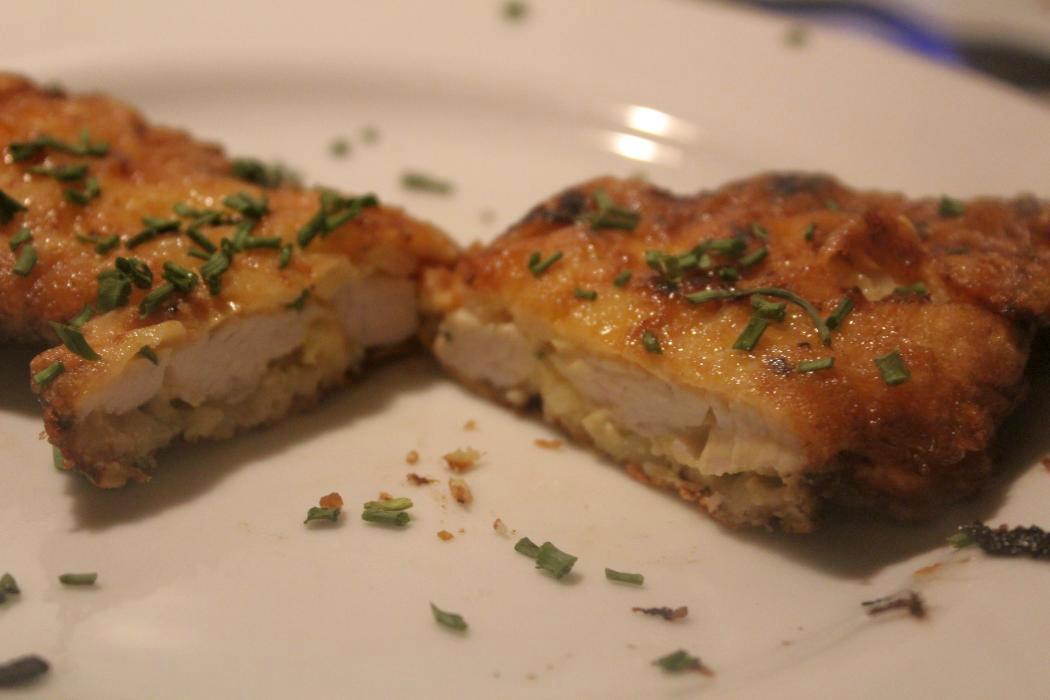 Danach im Ofen warmhalten und gehen lassen. Man braucht immer etwas Zeit, um die Teller anzurichten, evtl. für eine Soße, oder die Beilagen auf den Teller zu schaffen. Ich habe nur die Schnitzel gebraten, um zu schauen, wie das mit der Eihülle klappt und mein eigentliches Gericht an dem Tag sind Piccata milanese mit Nudeln. Deswegen habe ich dazu keine Pommes, oder eine andere Kartoffelbeilage gemacht.
