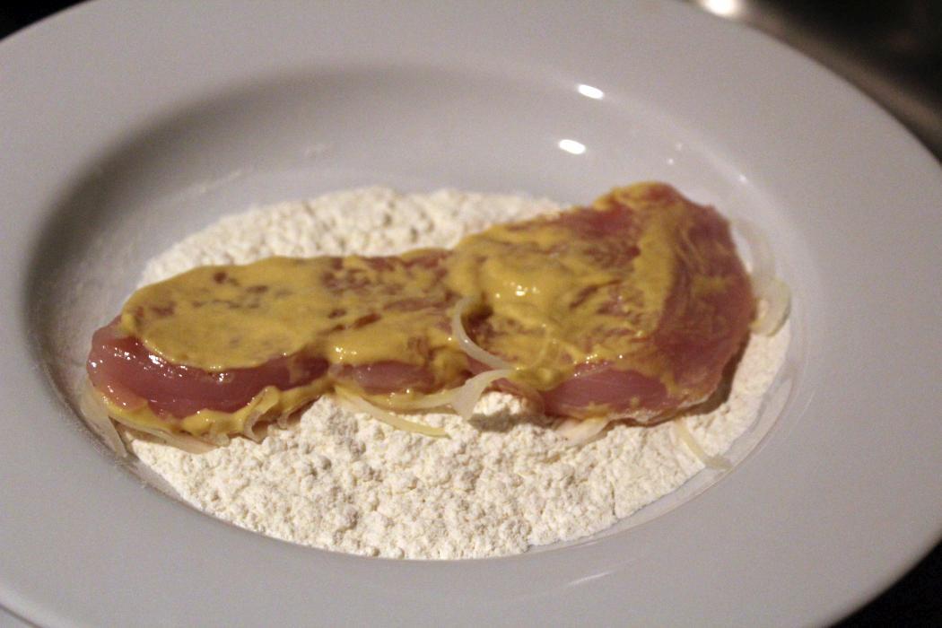 Danach die mit Zwiebeln bestückte Seite des Schnitzels in Mehl drücken, damit hinterher das verquirlte Ei besser hält