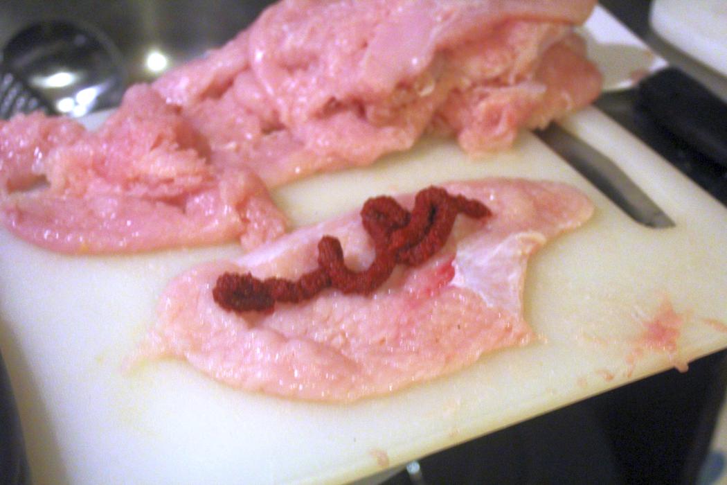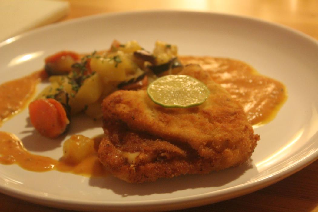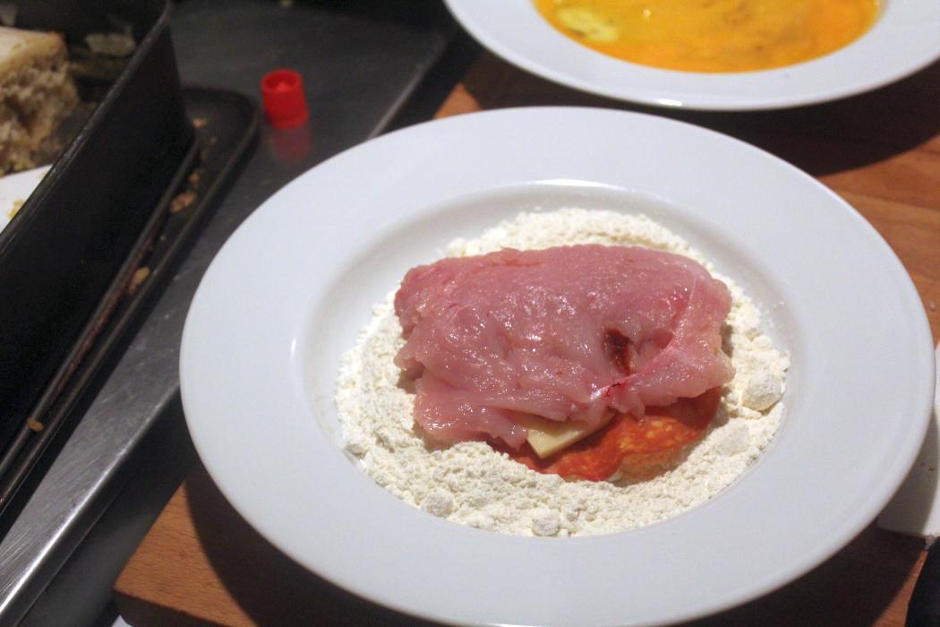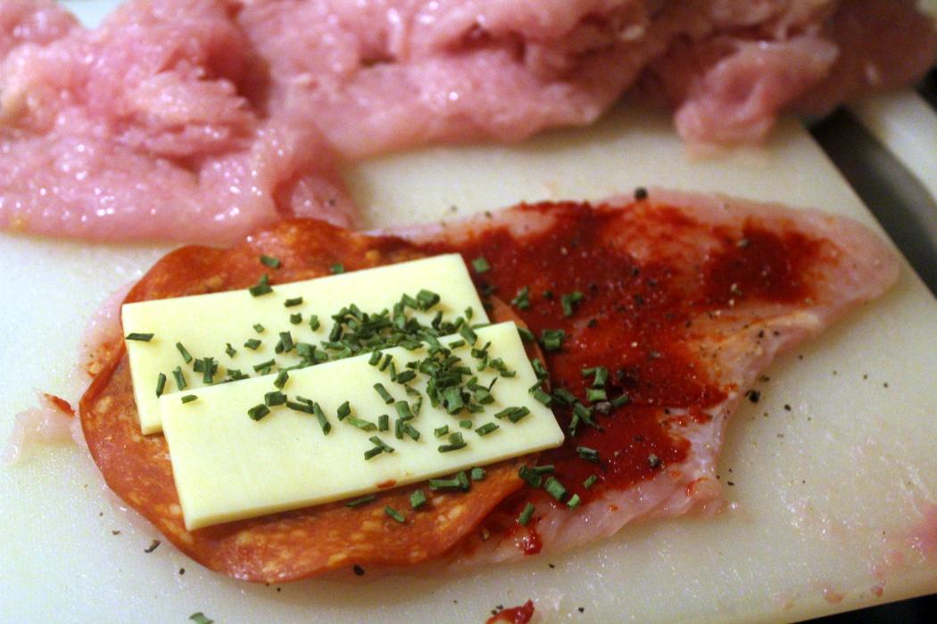 Das klassische Cordon bleu wird ja mit Schinken gemacht. Da dachte ich mir, ich wäre ganz schlau, wenn ich das Cordon vert (grün) nennen würde, aber das gibt es schon mit einer Gemüsefüllung. Dann habe ich überlegt, was denn noch passen würde. Cordon rouge gibt es auch schon, das hätte farblich gepasst, also bin ich am Ende bei Cordon feu (Feuer) gelandet, weil die Salamifüllung so leidlich scharf ist.