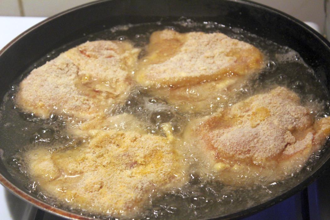 Öl in die Pfanne geben und so hoch befüllen, dass das Fleisch immer zur Hälfte im Öl schwimmt. Nur dann ist gleichmäßiges Garen gewährleistet.