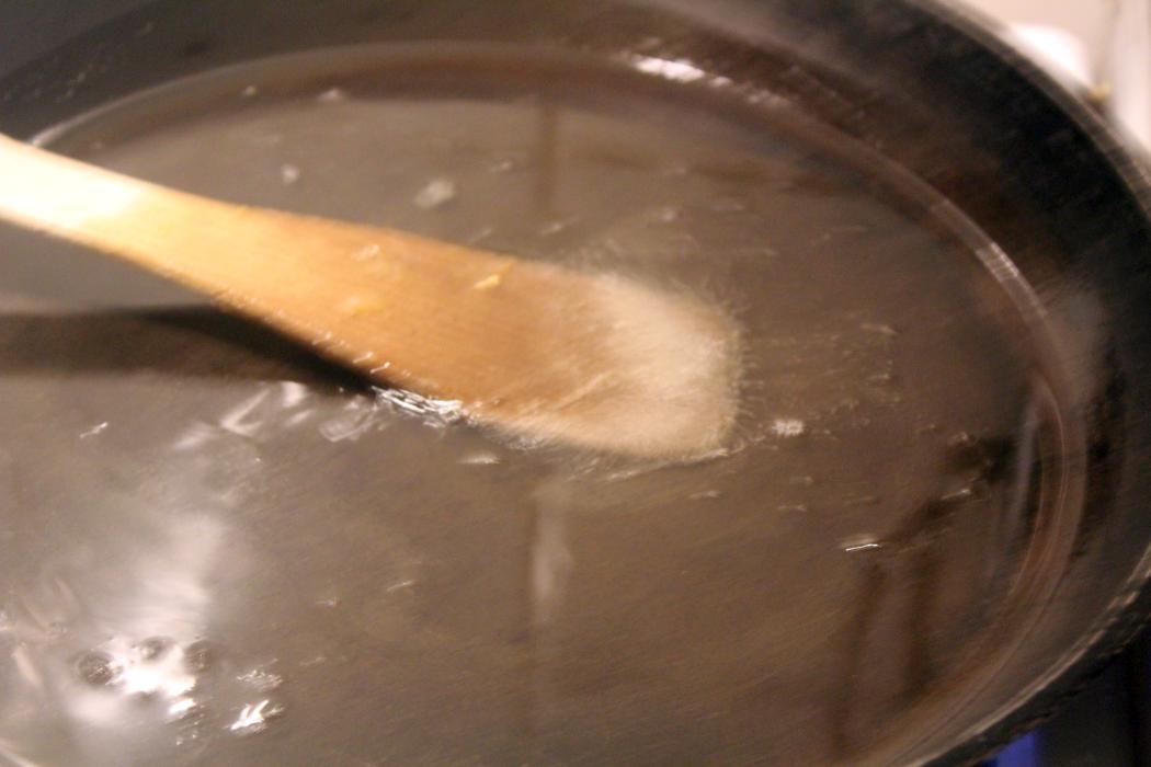 Das Öl hat die richtige Temperatur, wenn am Pfannenwender, oder Kochlöffel aus Holz die Blasen sprudelnd aufsteigen.