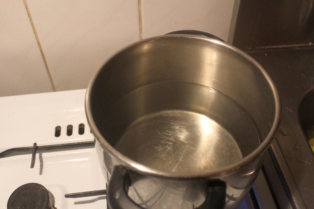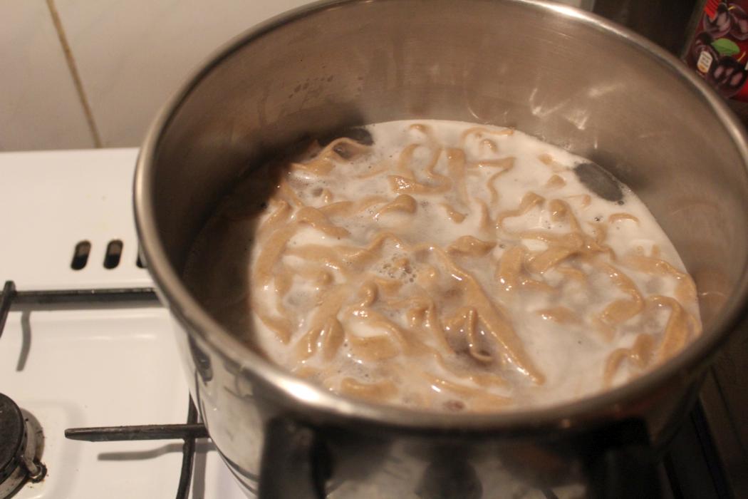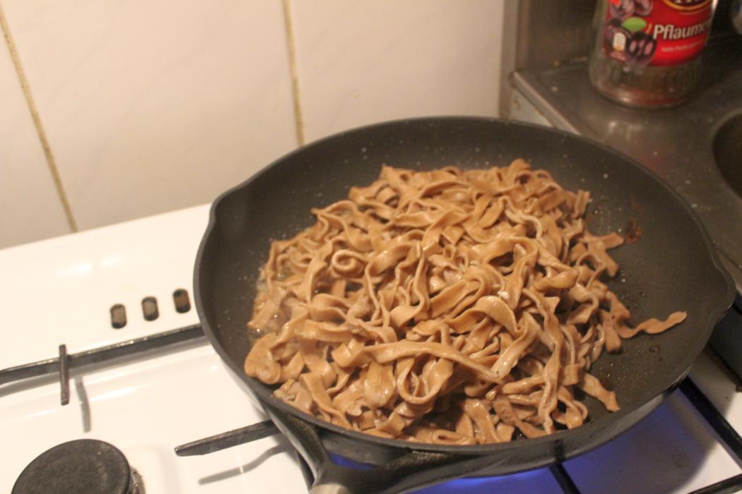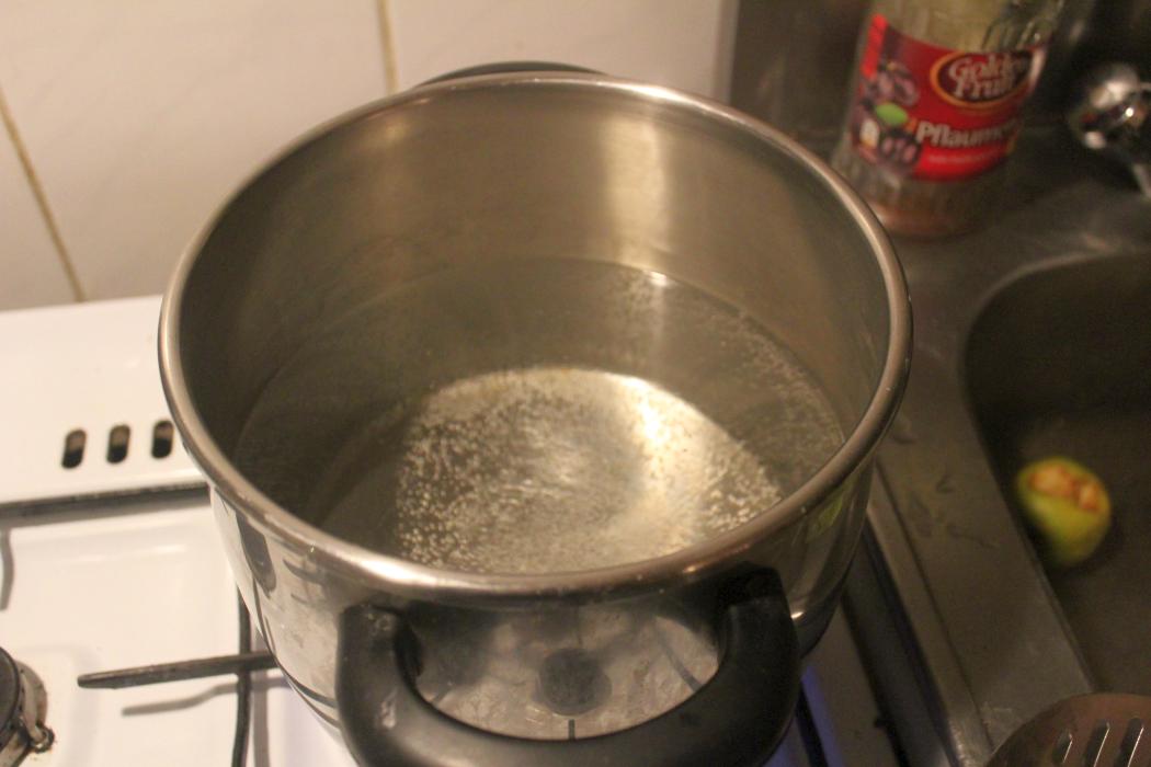 Das Nudelwasser kocht. Das habe ich einfach pur, ohne Salz gemacht, weil die Nudeln am Ende süß werden sollen.