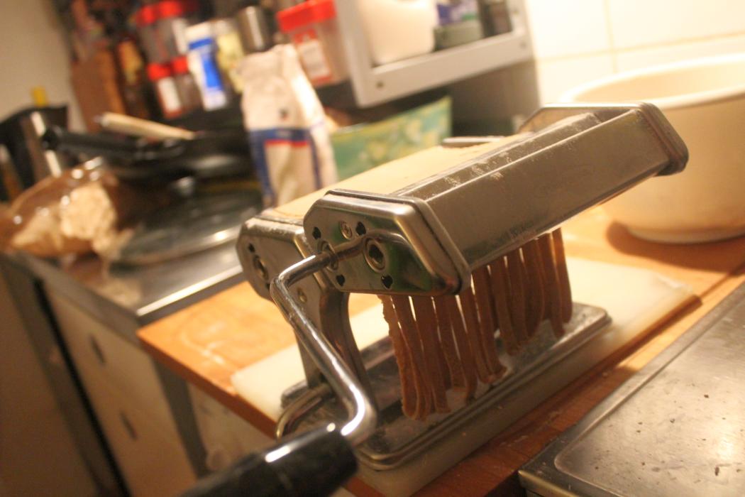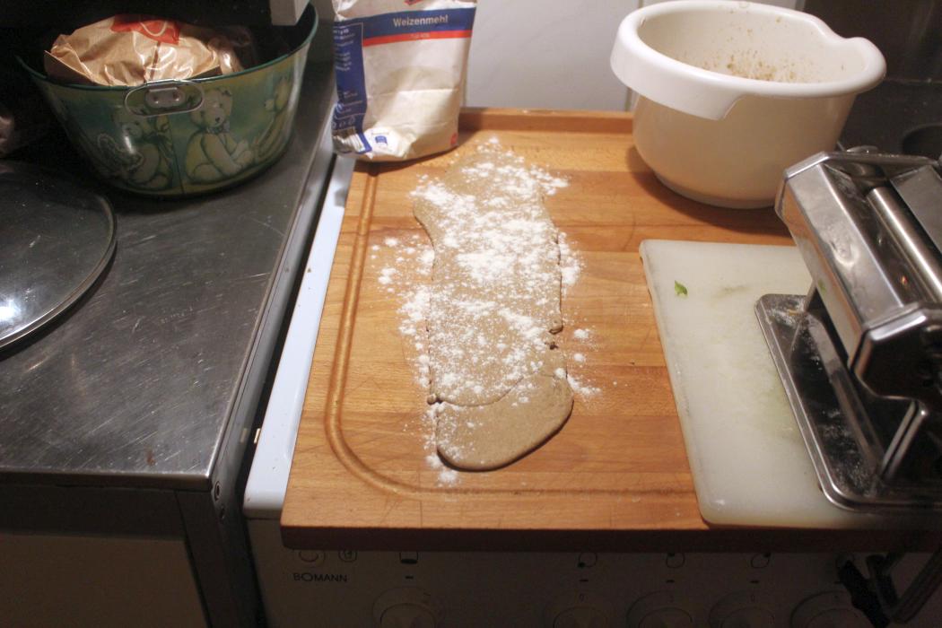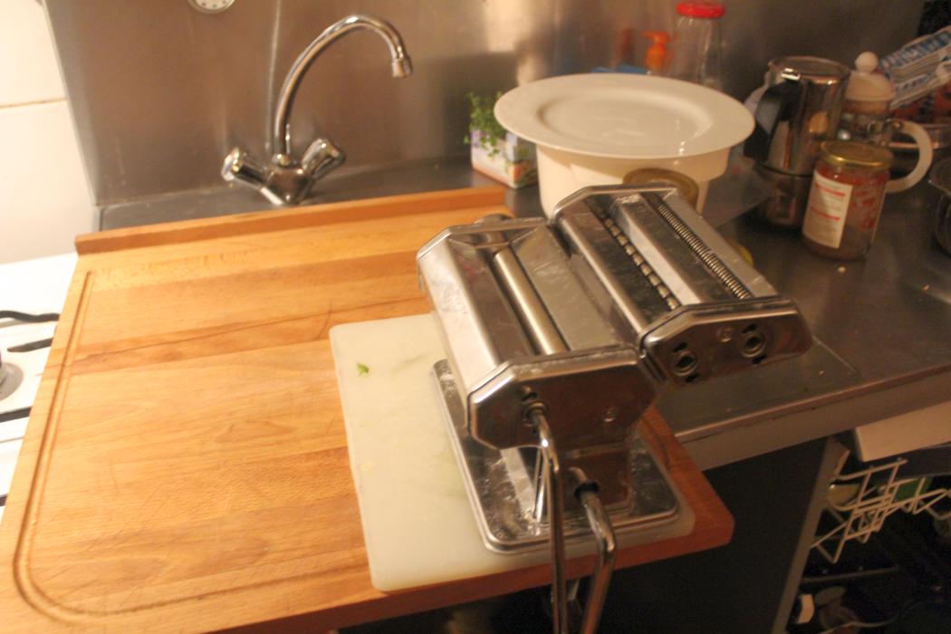 Ich habe meine Nudelmaschine vorbereitet, aber man kann den Teig auch mit dem Nudelholz von Hand ausrollen. Das habe ich vor der Maschine auch über Jahre gemacht, aber die Gefu Maschine für 30 Euro hat sich bei mir schon wirklich bezahlt gemacht.