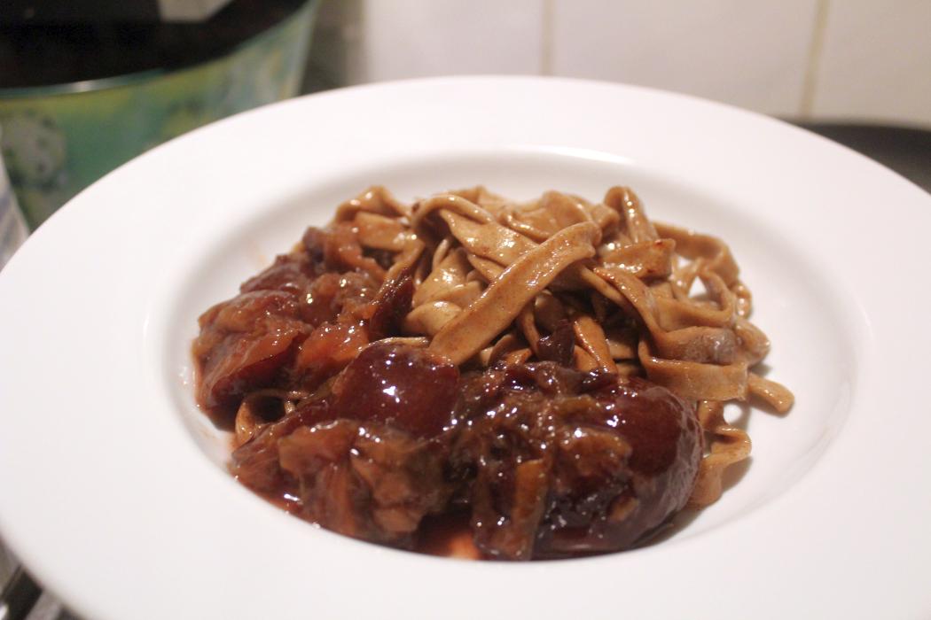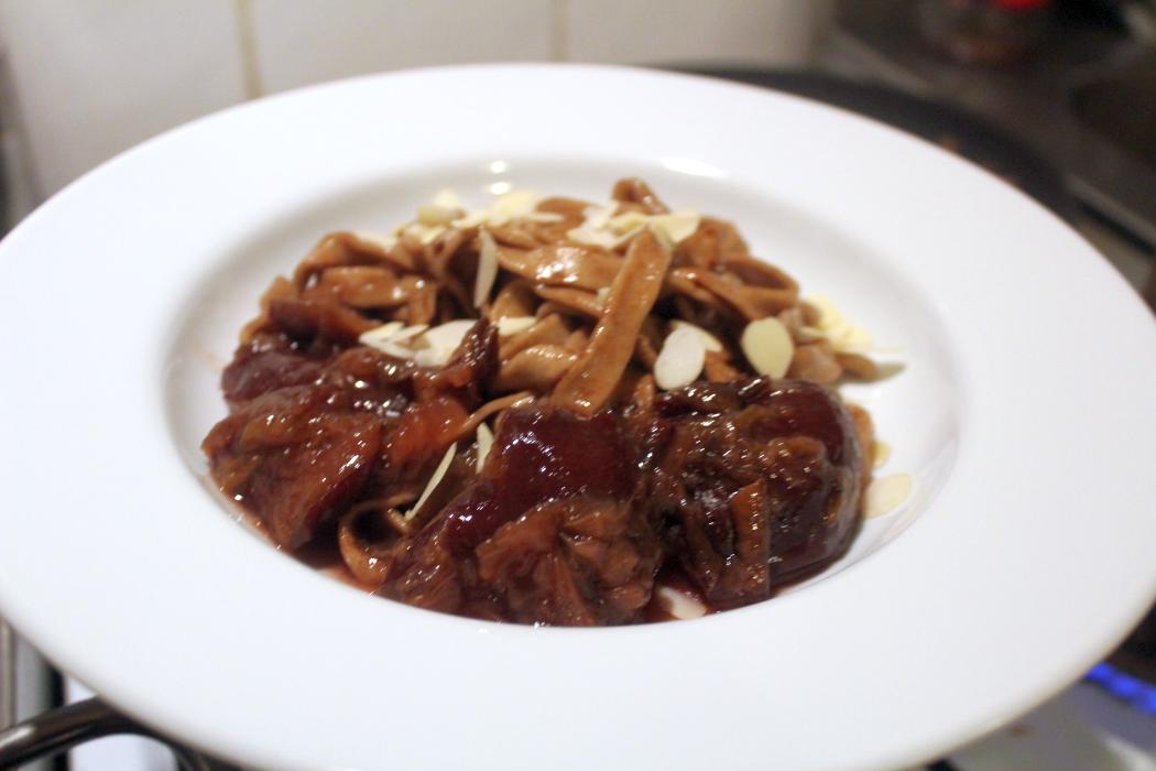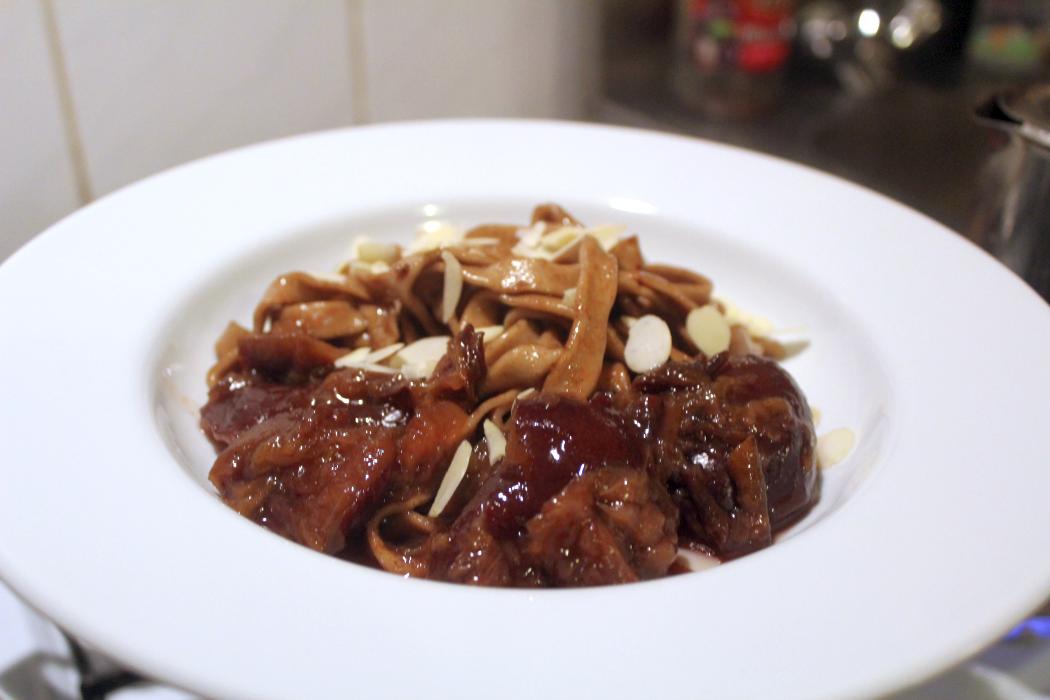Das Ganze aufkochen und auf kleiner Flamme einkochen. Ich habe festgestellt, dass meine Vorräte an Speisestärke gerade komplett verbraucht sind, also habe ich einfach ein bisschen mehr einkochen lassen. Wird Zeit dass ich Samstag einkaufen gehe. Dem Geschmack ist das ohnehin dienlicher die Soße einzukochen, als das von außen anzudicken.
