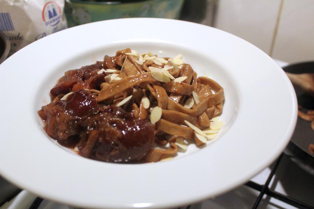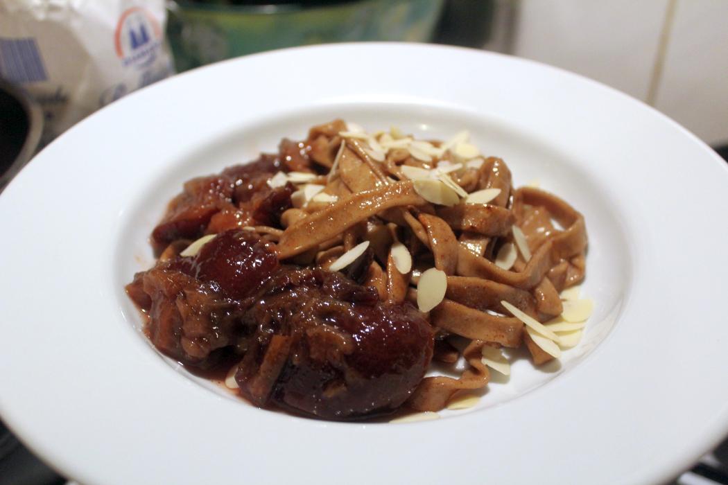 Das ist irre lecker. Gutes Mundgefühl der frisch gekochten Nudeln, die anschließend in Butter mit Zimt und Zucker geschwenkt wurden, dann das Pflaumenkompott und die gehobelten Mandeln für das Knuspern im Mund.