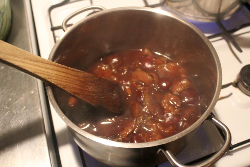 Jetzt machen wir noch schnell eine zweite Baustelle für die Soße auf. Ich hätte eigentlich Sauerkirschen genommen, aber nur noch Pflaumen im Vorratsschrank gefunden. Egal, passt auch.