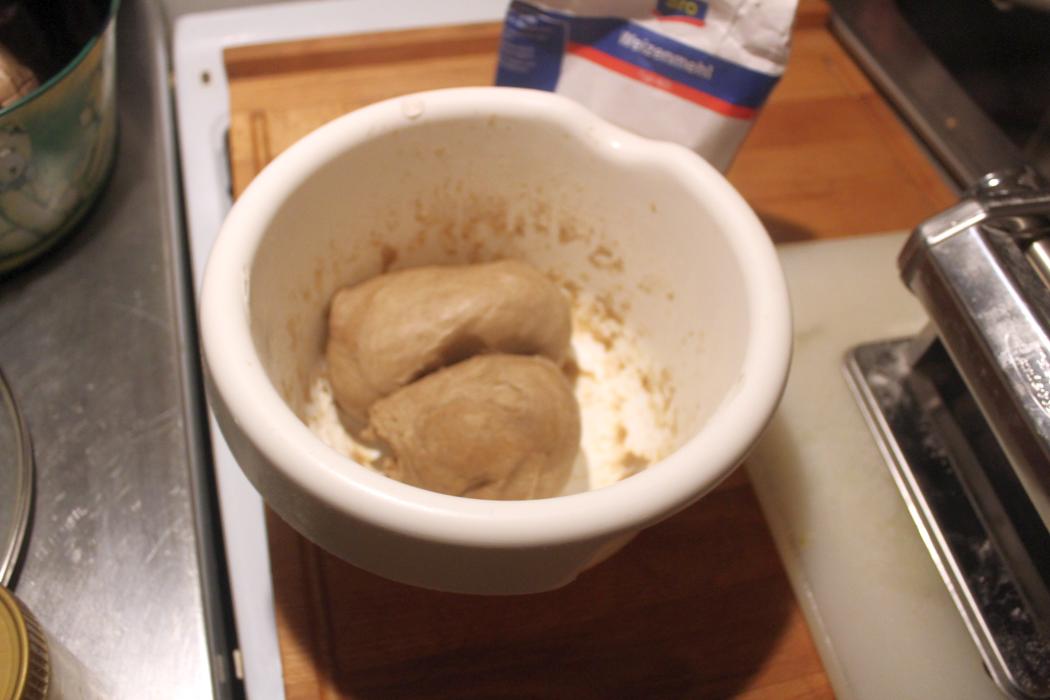 Das ist der Teig. Der duftet richtig schön nach Zimt. Den teile ich mir auf, weil ich hier nur Probierportionen für Euch herstelle. Wenn alle am Tisch sitzen würden, dann würde ich die ganze Teigmenge verwenden. So habe ich aber nur meine Frau als Versuchskaninchen. Die zweite Teighälfte, nehme ich für eine süße Lasagne. Das Rezept bekommt Ihr auch noch.