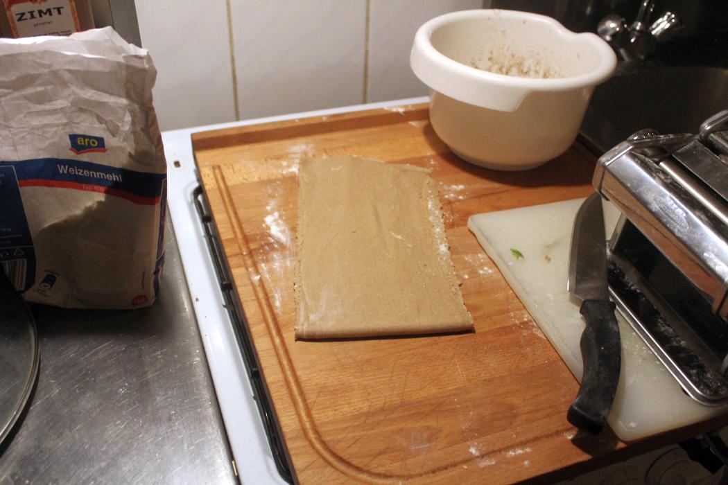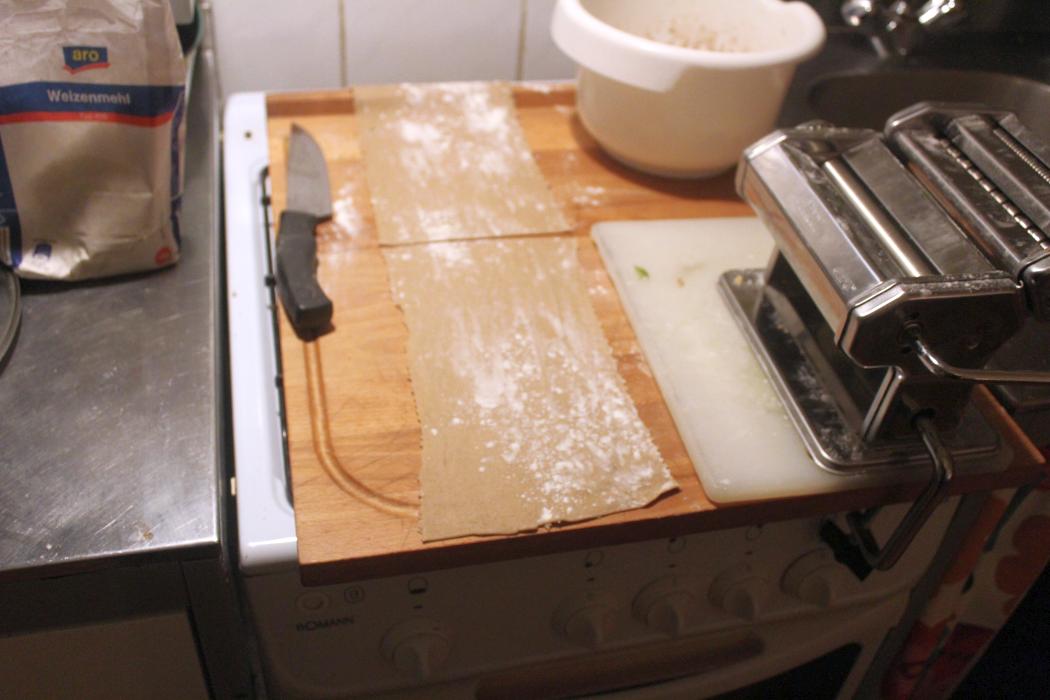 Teig durch die Nudelmaschine jagen und Bahnen davon machen.