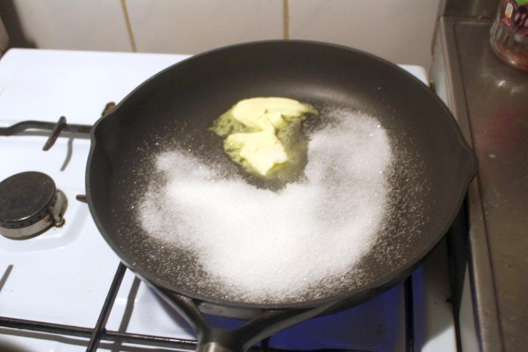 Wenn der Zucker anfängt zu karamellisieren, kommen die Nudeln in die Pfanne. Mit der Temperatur auf mittlere Temperatur runtergehen.