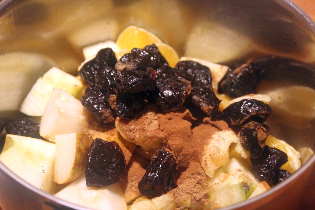 Ich lasse bei Äpfeln und Birnen die Schale dran. Am Ende wird das nach dem Kochen alles noch einmal mit dem Pürierstab bearbeitet und danach weiß niemand mehr, ob da Schalen mit eingekocht wurden, oder nicht. Die Zutaten kommen als in einen kleinen Kochtopf.
