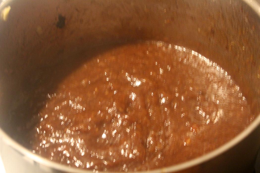 Nach einer halben Stunde sollten die Äpfel weich sein und sich das Fruchtfleisch von der Schale lösen. Bis dahin sollte der Topfinhalt nur leicht simmern und nicht richtig sprudelnd kochen.