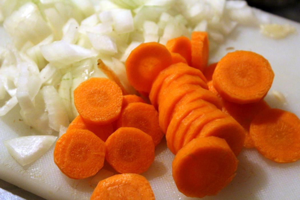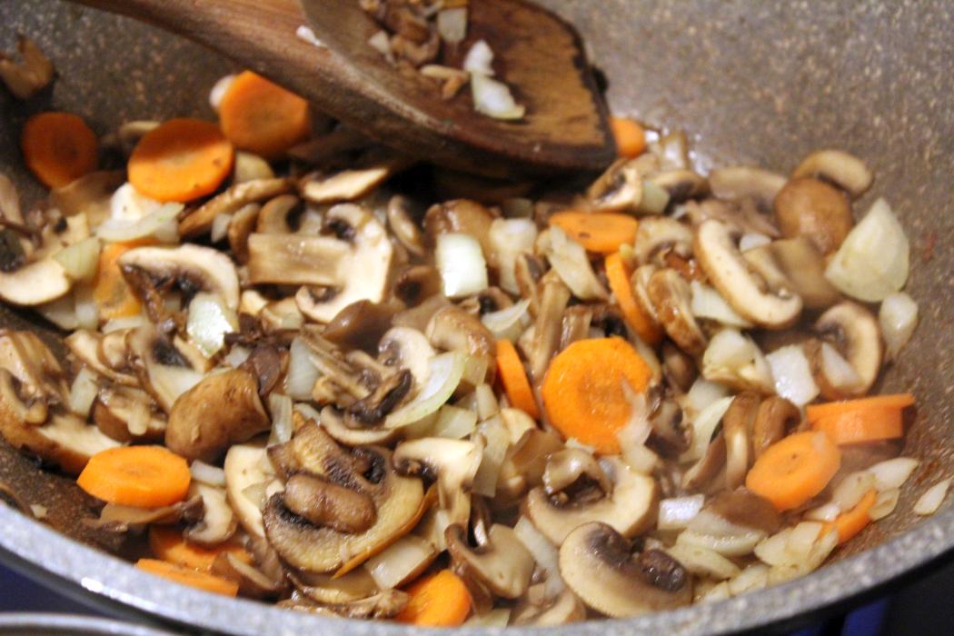 Möhre und Zwiebeln in den Wok geben, wenn die Champignons schon Flüssigkeit abgegeben haben und fest sind, also nicht mehr wie Gummi im Mund liegen.