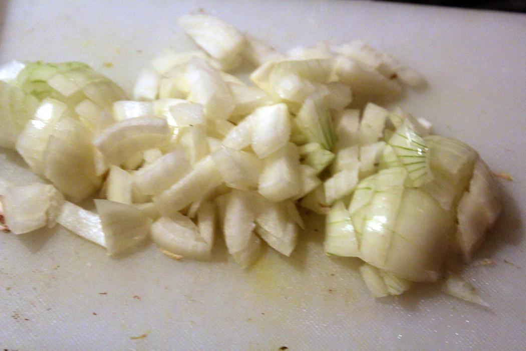 Haut entfernen und das Fleisch von den Knochen holen. In mundgerechte Stücke schneiden.