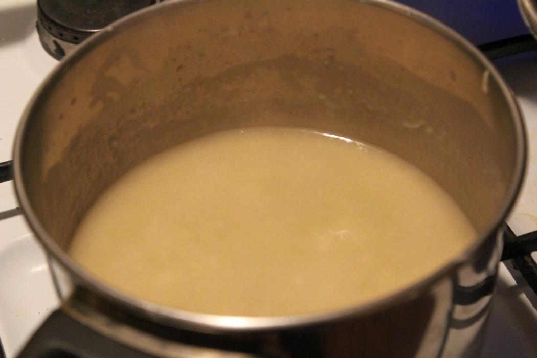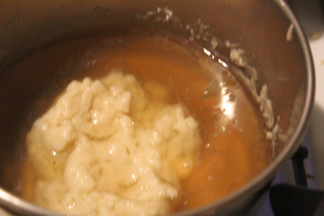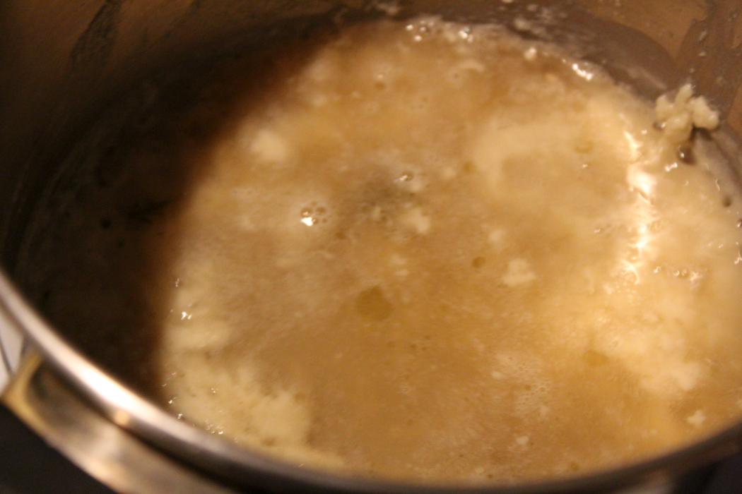 Erstmal eine Kelle meiner selbst gekochten Hüherbrühe dazu kippen und den Topf wieder auf den Herd stellen und bei mittlerer Hitze unter ständigem Rühren erwärmen, bis sich die Mühlschwitze in eine Konsistenz wie Tapetenkleister verwandelt. Die Brühe soll kalt, oder lauwarm sein. Wenn sie zu heiß ist, wenn sie mit Mehl und Fett in Berührung kommt, neigt die Mehlschwitze zur Klumpenbildung.