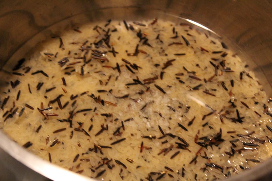 Also Beilage nehme ich eine Wildreismischung. Jetzt haben wir noch ungefähr 15 Minuten Zeit, bis alles fertig sein muss.