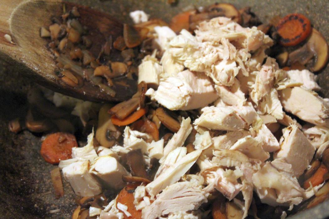 Hier kommt das Fleisch, das ich beim Kochen der Hühnerbrühe gewonnen habe. Davon nehme ich nur einen Teil, weil ich noch andere Gerichte damit kochen möchte. Nur meine Meinung, aber davon brauche ich auch nicht viel für das Frikassee, weil ich viele andere schöne Zutaten darin habe und das Fleisch nur eine von mehreren ist, die aber nicht unbedingt dominieren muss.