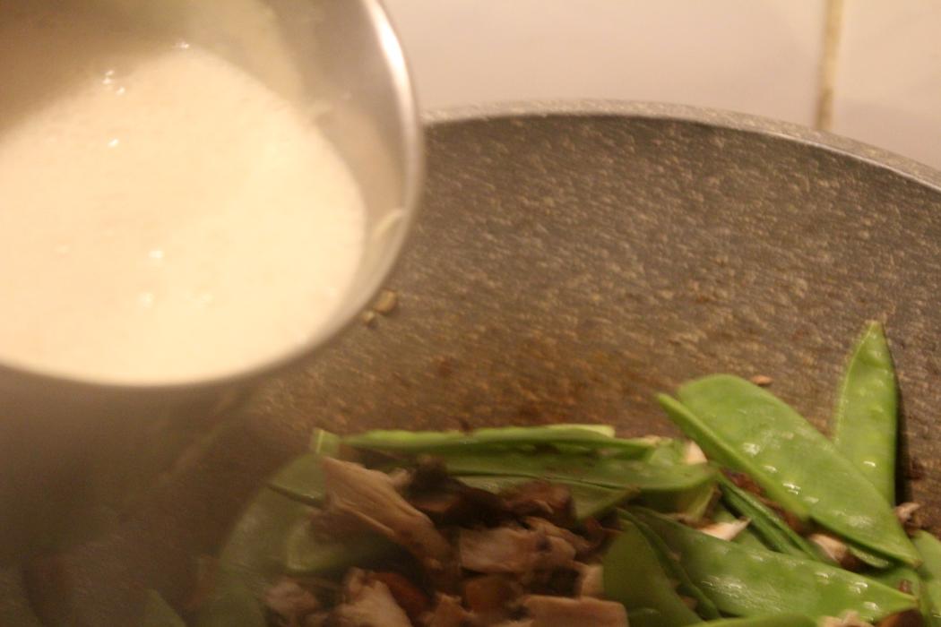 So viel Brühe dazu geben, dass die Mehlschwitze beim erwärmen und verrühren eine angenehme Konsistenz bekommt. Die soll gut vom Löffel laufen und sich im Mund leicht cremig anfühlen und noch für Bindung der anderen Zutaten im Wok dienen, wenn man das später alles miteinander vermischt.