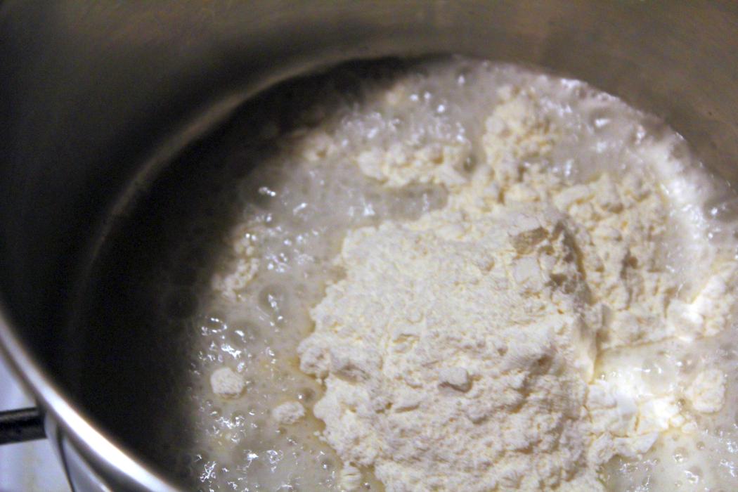 Wenn das Fett heiß ist, zwei Esslöffel Mehl dazu geben und schnell rühren, Topf vom Herd nehmen, wenn die Mehlschwitze nicht dunkel werden soll.