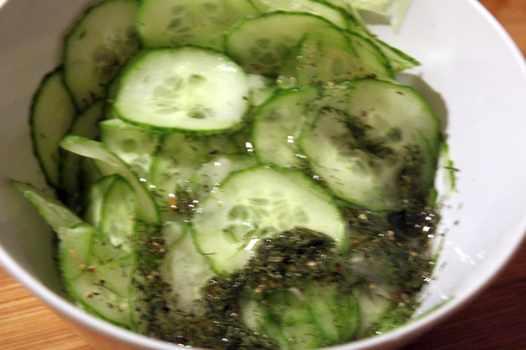 Eine halbe Salatgurke hobeln, mit Salz, Pfeffer, Zucker, Weißweinessig, Rapsöl und Dill marinieren.