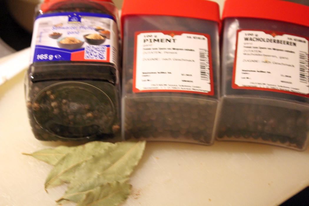 Pfefferkörner, Piment, Wacholderbeeren, Lorbeerblätter, viel kann viel. Wem nix einfällt, der nimmt immer löffelweise von allem.