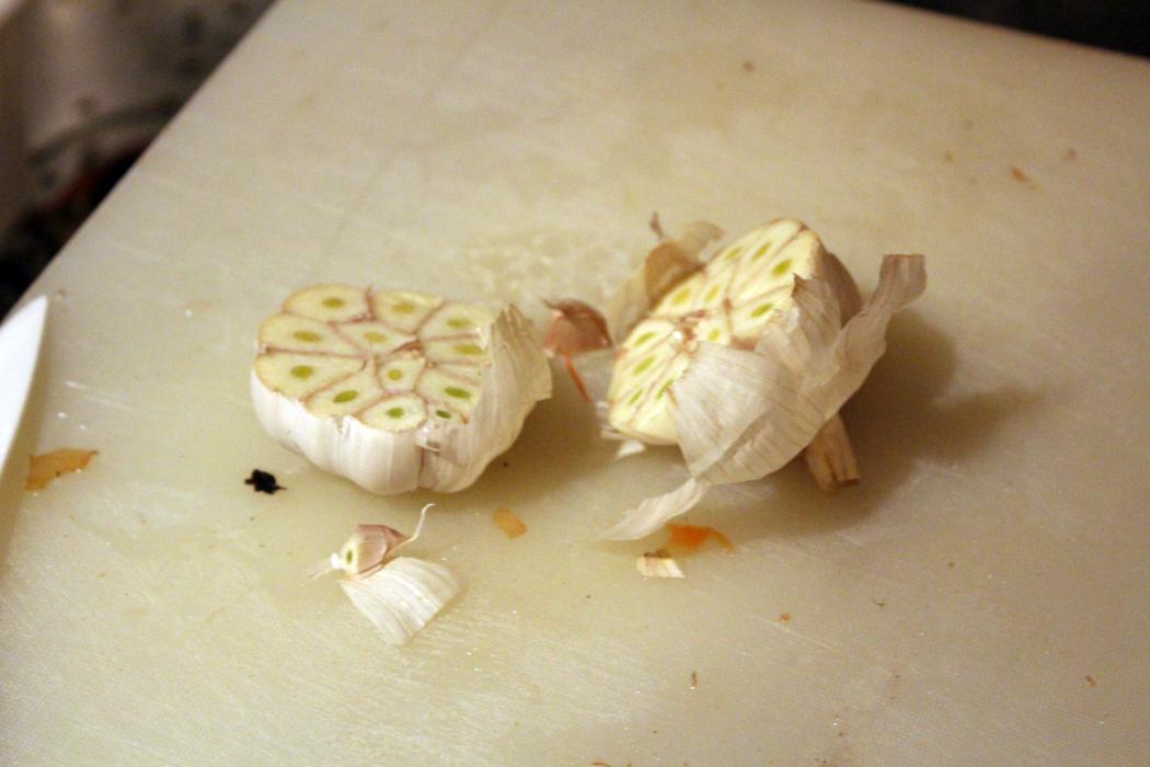 Eine Knoblauchknolle einfach nur halbieren, wie alle anderen Zutaten einfach in den Topf werfen.