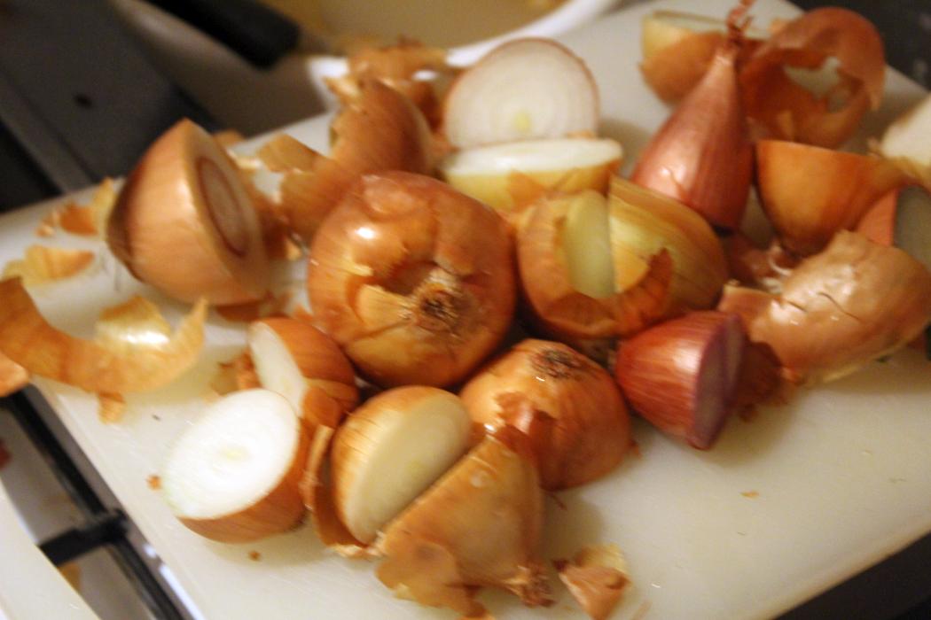 Zwiebeln einfach nur halbieren und die Schalen dran lassen. Das gibt eine gute Farbe für die Brühe