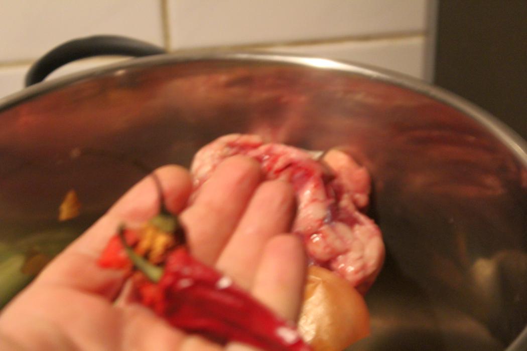 Das sind 1,3 Kilo Ochsenschwanz. Man kann den vorher auch noch anrösten, aber ich wollte eine ganz klare Brühe haben und nicht viele Schwebstoffe, deswegen werfe ich den einfach nur so in den Topf.