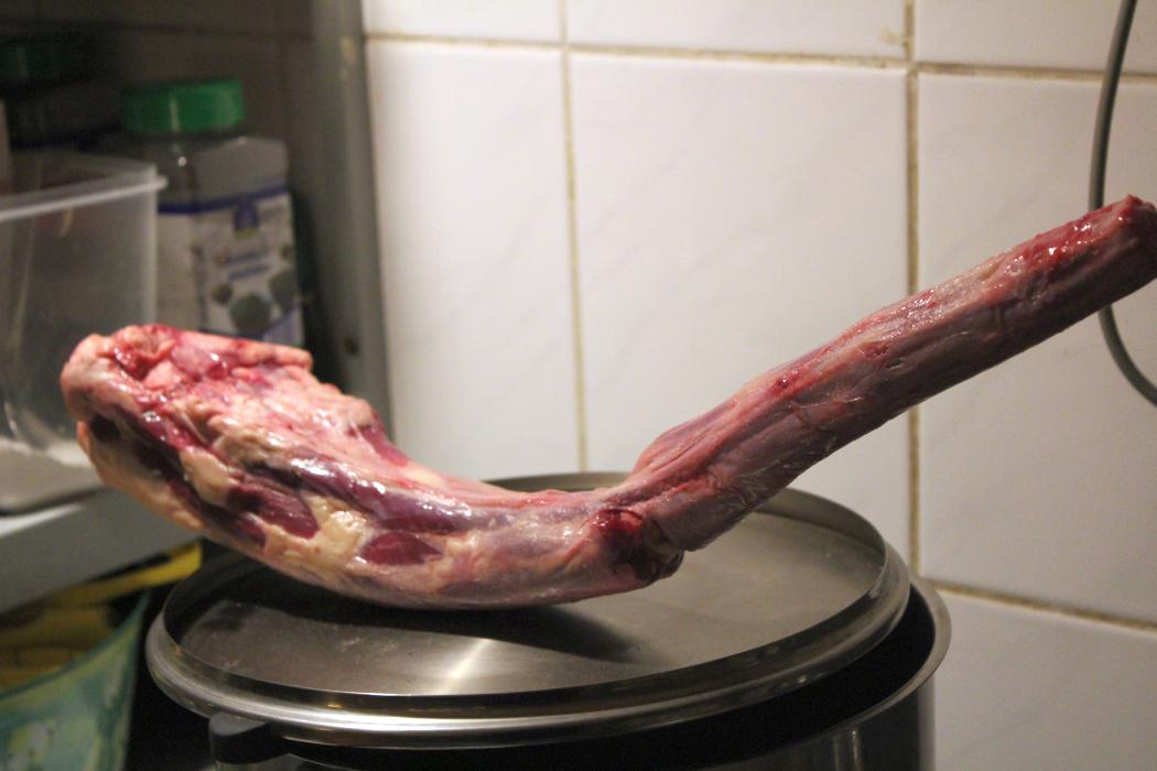 Nach sechs Stunden sieht der Ochsenschwanz so aus. Dann packe ich den nach dem Auskühlen auf der Fensterbank in den Kühlschrank, um ihn am nächsten Tag weiter verarbeiten zu können. Dann ist das Fleisch wieder fest und fasert nicht beim Schneiden.