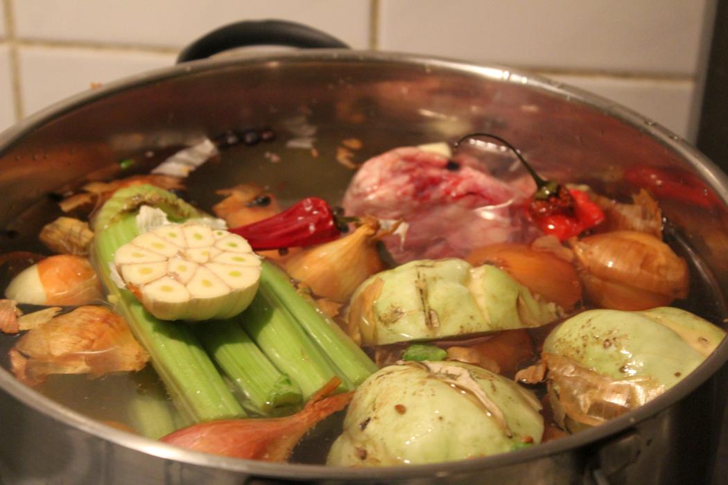 Ich setze Brühe grundsätzlich kalt auf. Wie immer gibt es auch hier Gegenmeinungen, aber wenn man sie kalt aufsetzt bildet sich kein Schaum auf der Brühe. Meine Brühe ist deswegen immer sehr klar.