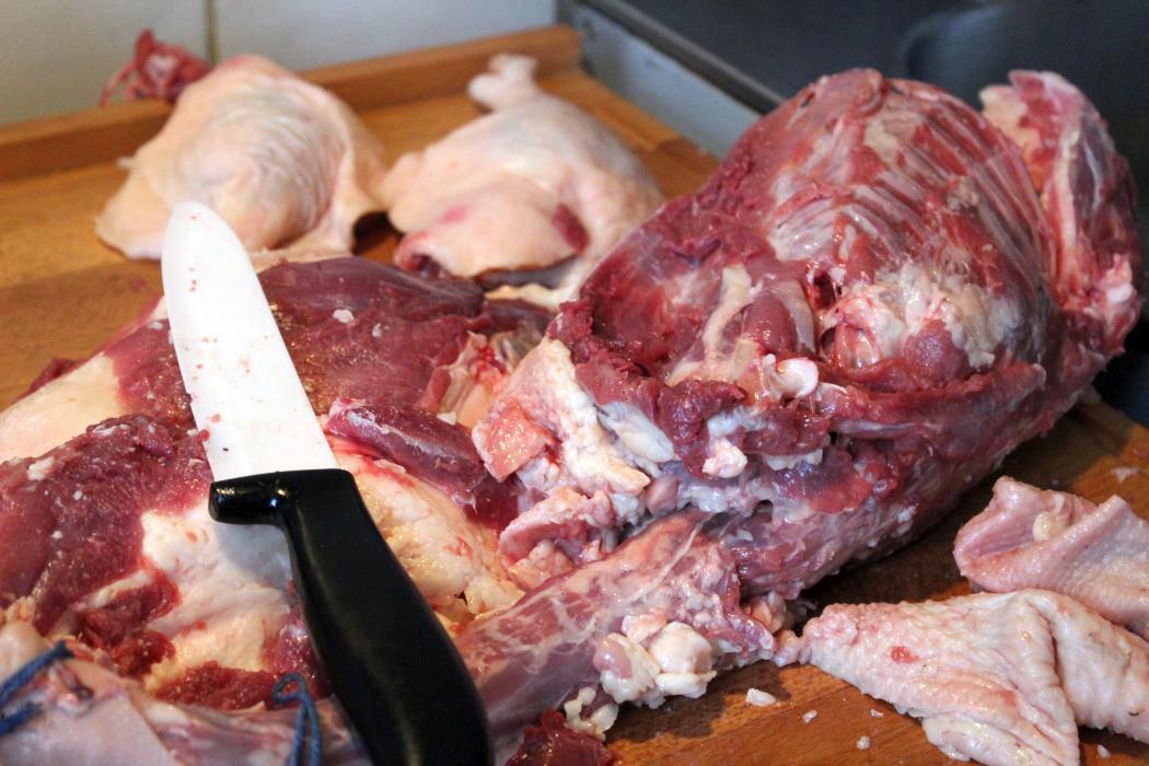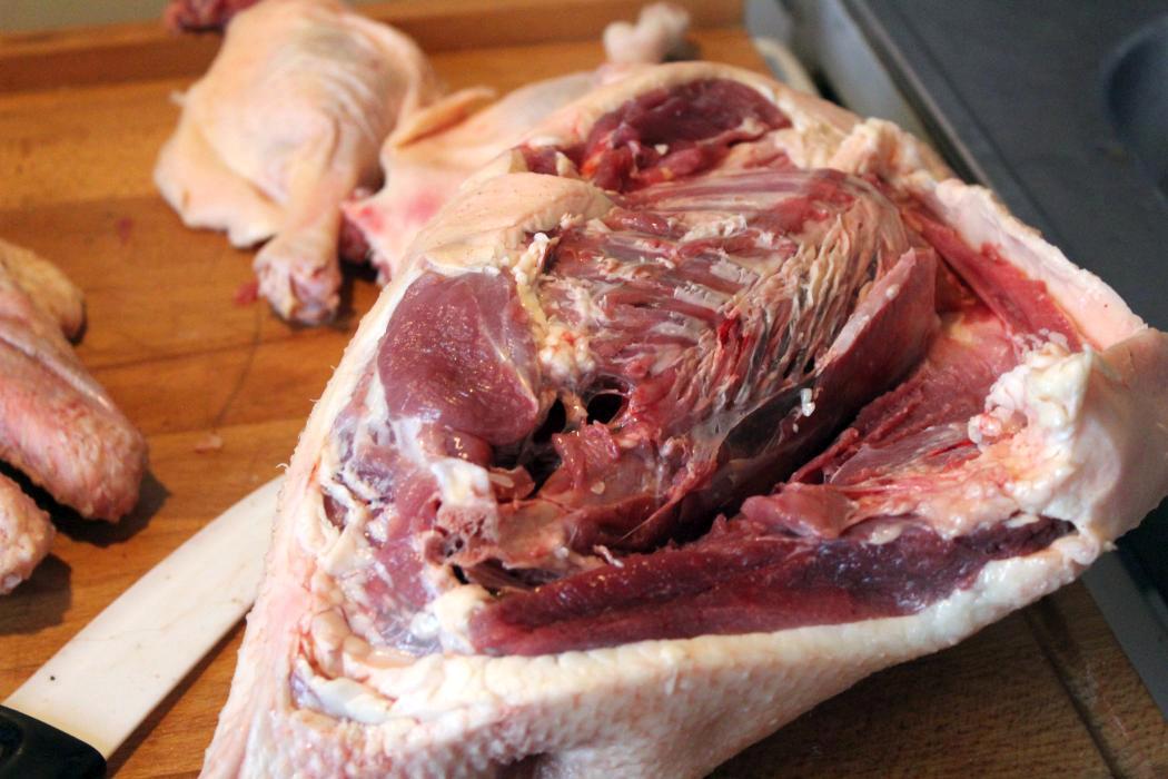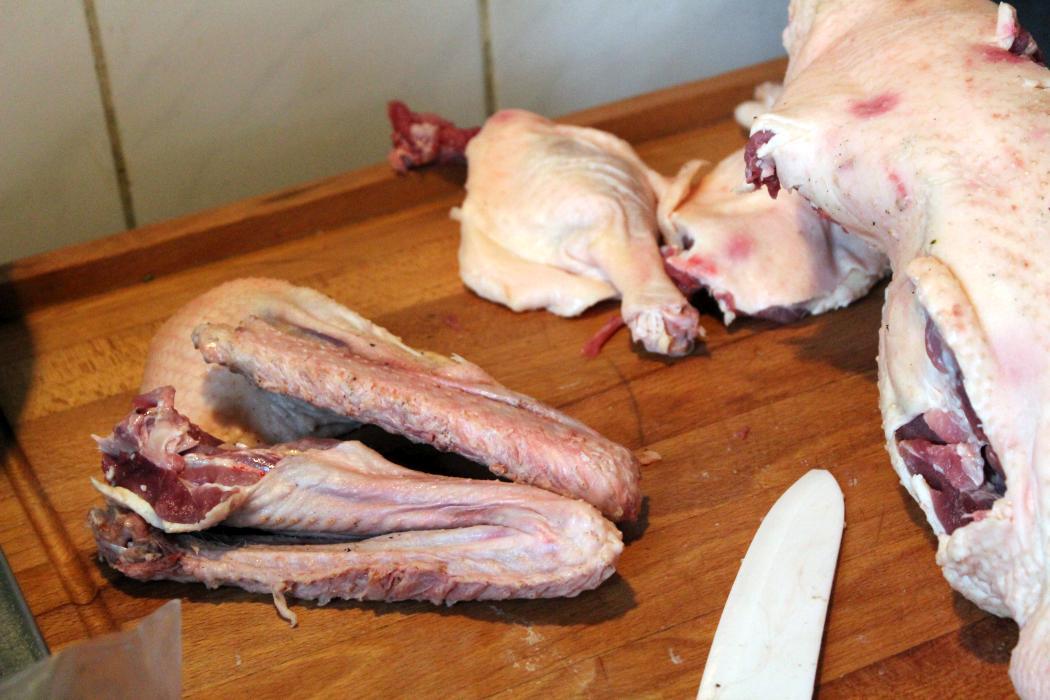 Die Gans habe ich mit dem Messer zerlegt. Die Teile aus denen ich Fleischgerichte machen wollte, wurden abgetrennt und verpackt im Kühlschrank gelagert.