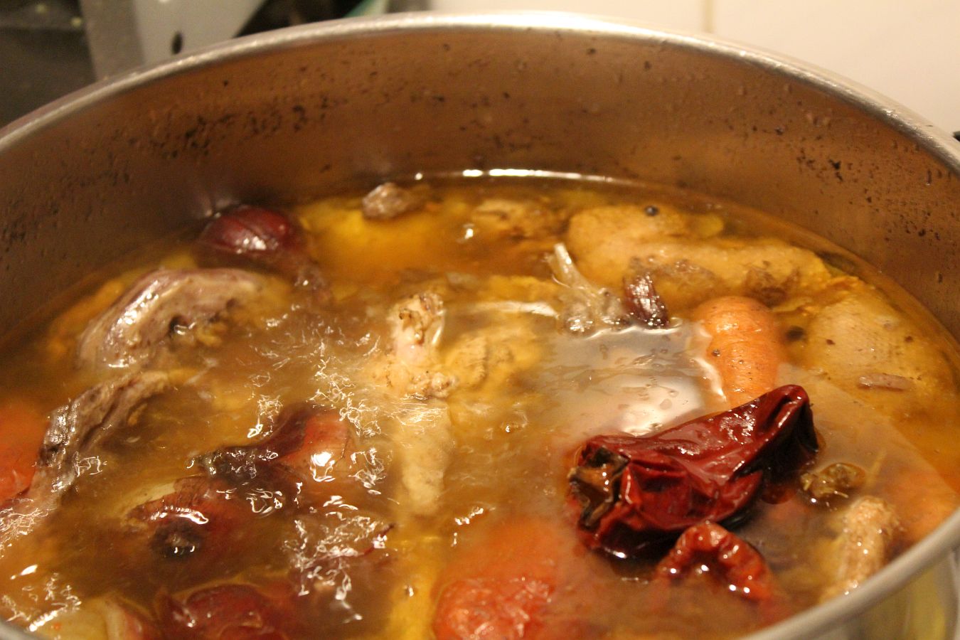 Hinten rechts der Topf mit der Brühe, vorne links der kleinere Topf in dem ich eine Gänsesuppe auf Basis der Brühe mit dem Gänsefleisch gekocht habe, das ich nach dem Kochen von der Karkasse abgezogen habe.