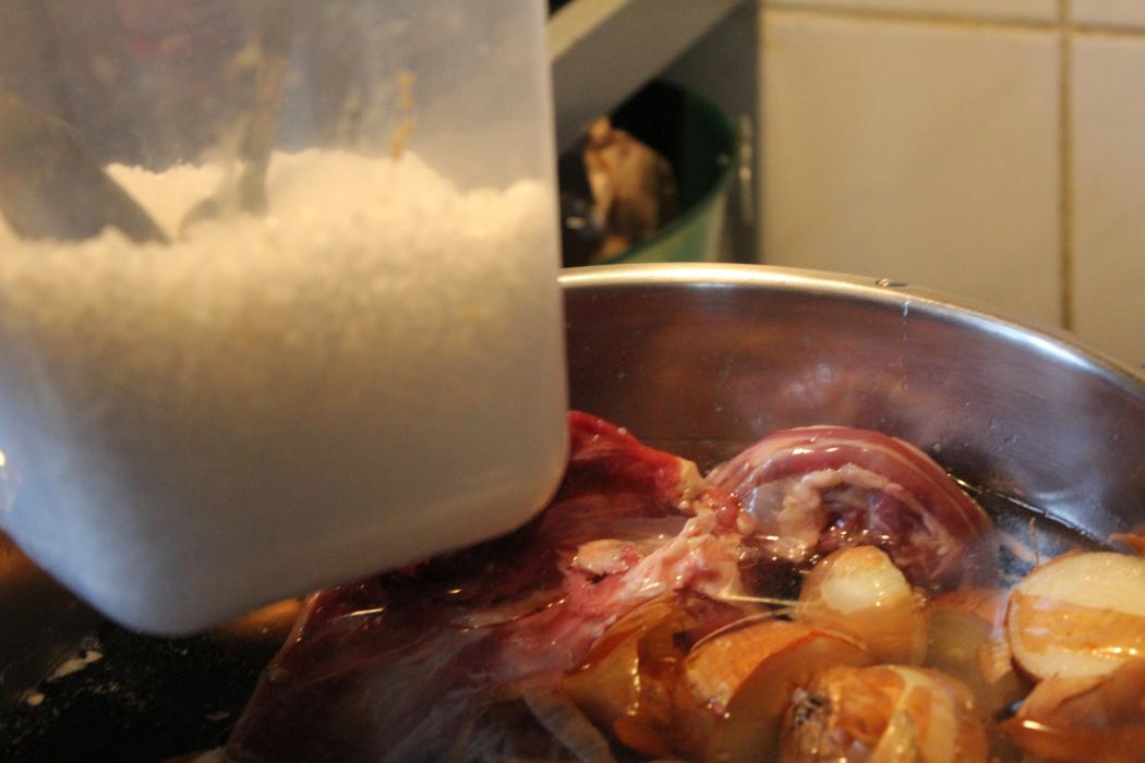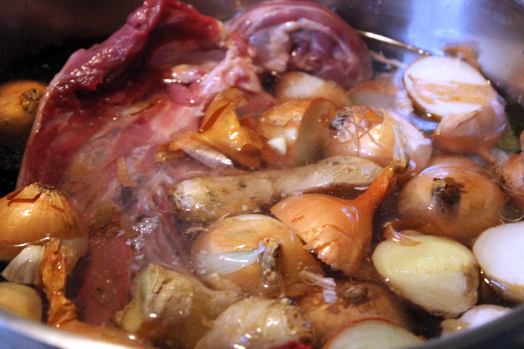 Die Zwiebeln werden mit Schale in den Topf geworfen und geben damit der Brühe eine schöne Farbe