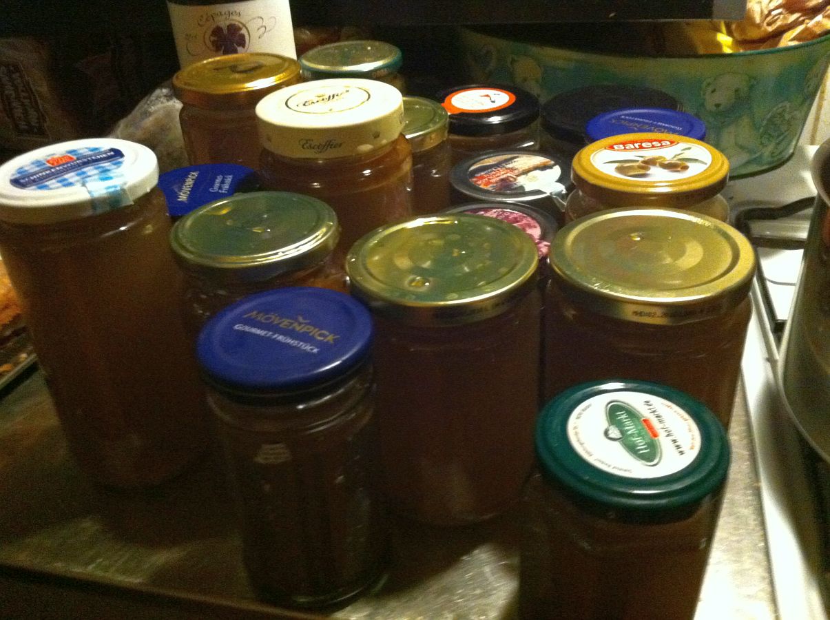 Hier baue ich schon meine Batterie Schraubgläser auf, denn die Brühe koche ich bei 130 Grad 1,5 Stunden im Backofen ein