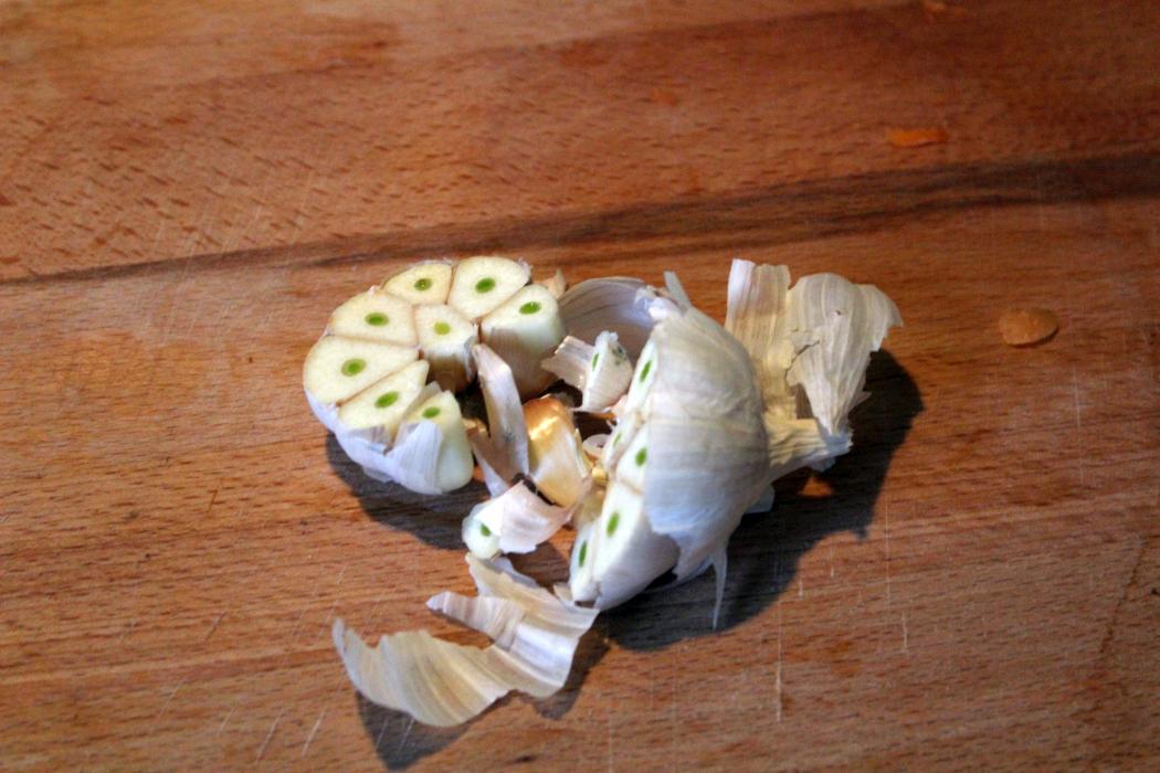Eine große Knoblauchknolle einfach nur halbieren und mit Schale in den Topf geben.