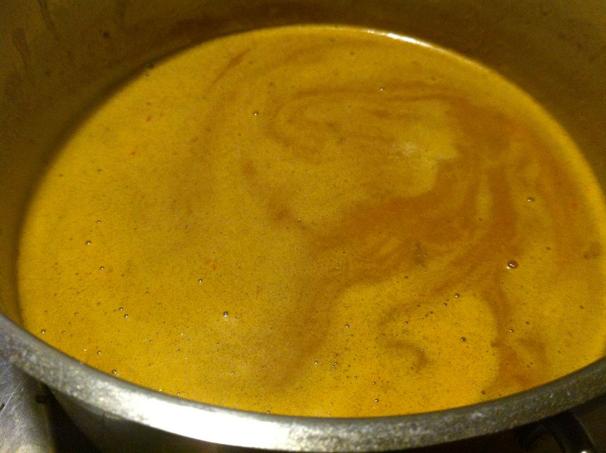 Suppe aufkochen. Nach 20 Minuten sind die Zwiebeln und der Knoblauch so weich gekocht, dass man die Suppe pürieren kann. Gebt der Suppe hinterher noch ausreichend Zeit auf dem Herd, weil dann der Mehlgeschmack wieder verschwindet, den man mit der Mehlschwitze am Anfang hinein bringt. Ich lasse die Suppe noch 30 Minuten einkochen.