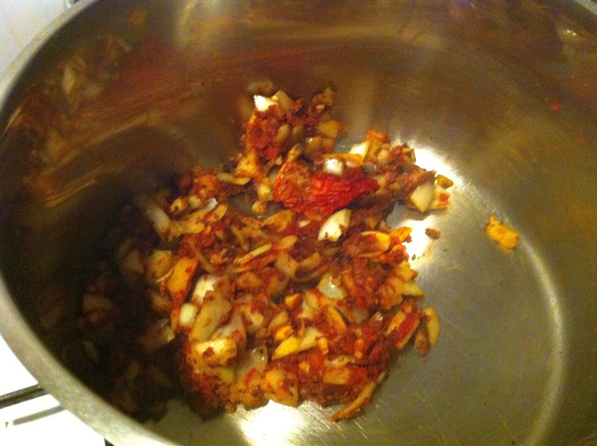 Wenn das Tomatenmark anfängt zu bräunen, ein bis zwei Schöpfkellen Brühe in den Topf geben, und kräftig rühren, bis keine Klumpen mehr da sind.