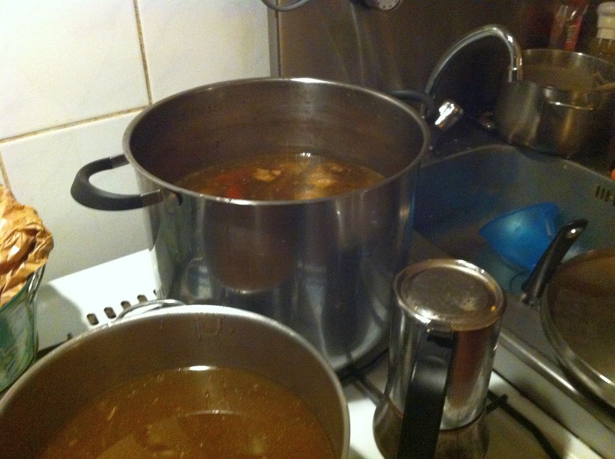 2,5 Liter Brühe brauchen wir für die Gänsesuppe. Die kocht sich dann ungefähr auf 1,5 Liter zusammen und ist somit eine Vorspeise für 4 Personen