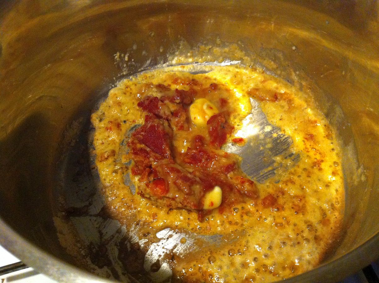 Butter und Mehl zusammen anschwitzen, das Tomatenmark dabei anrösten.