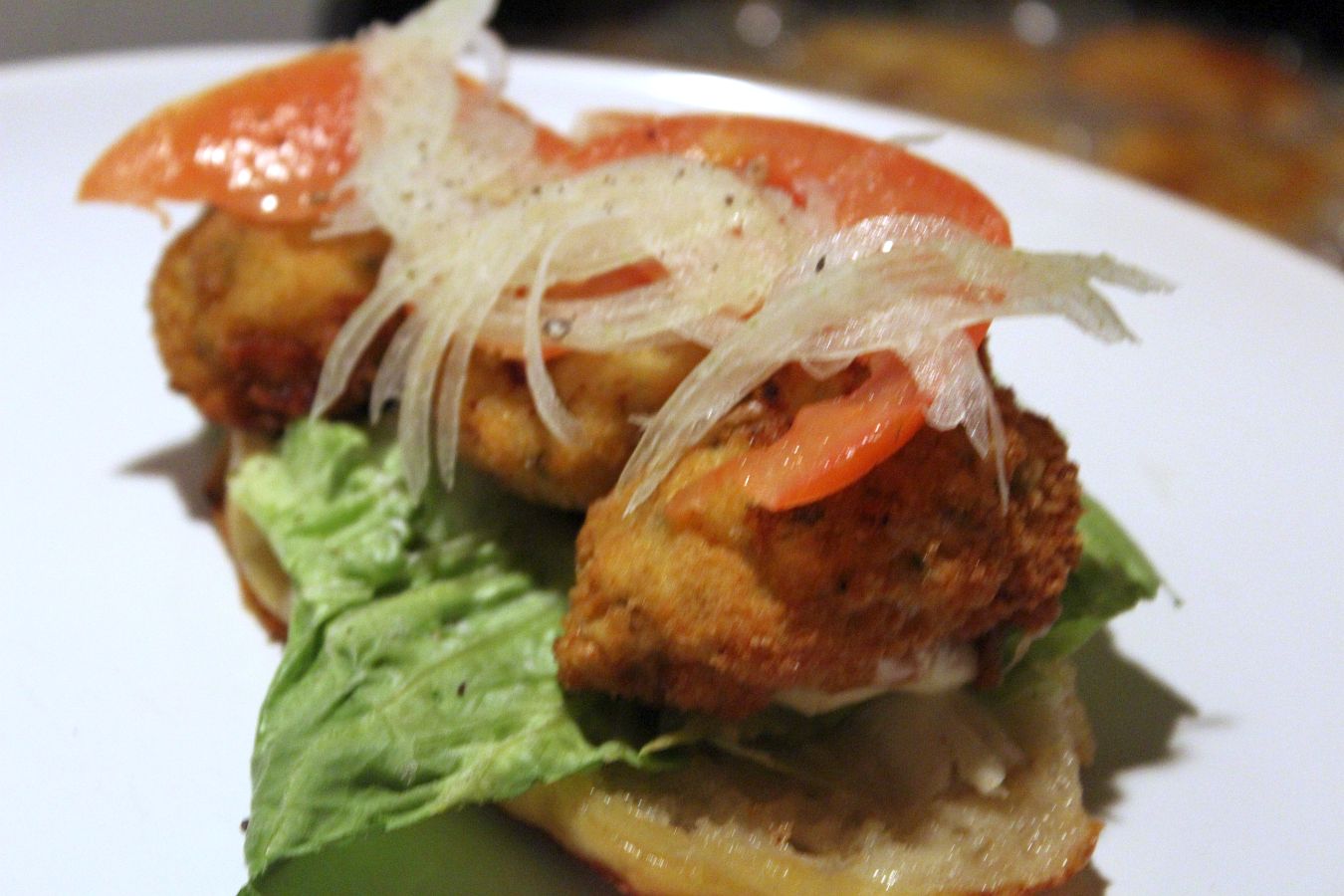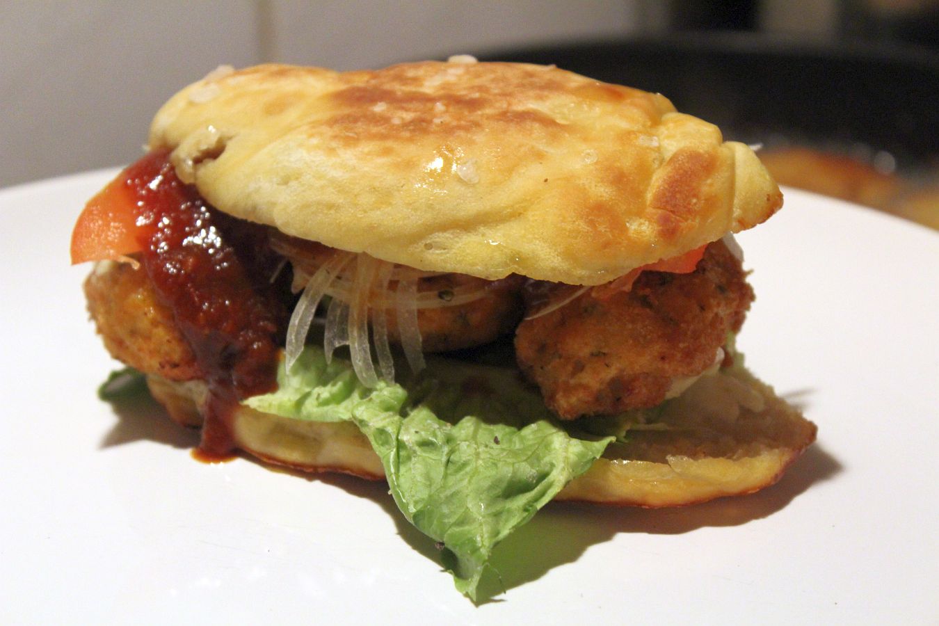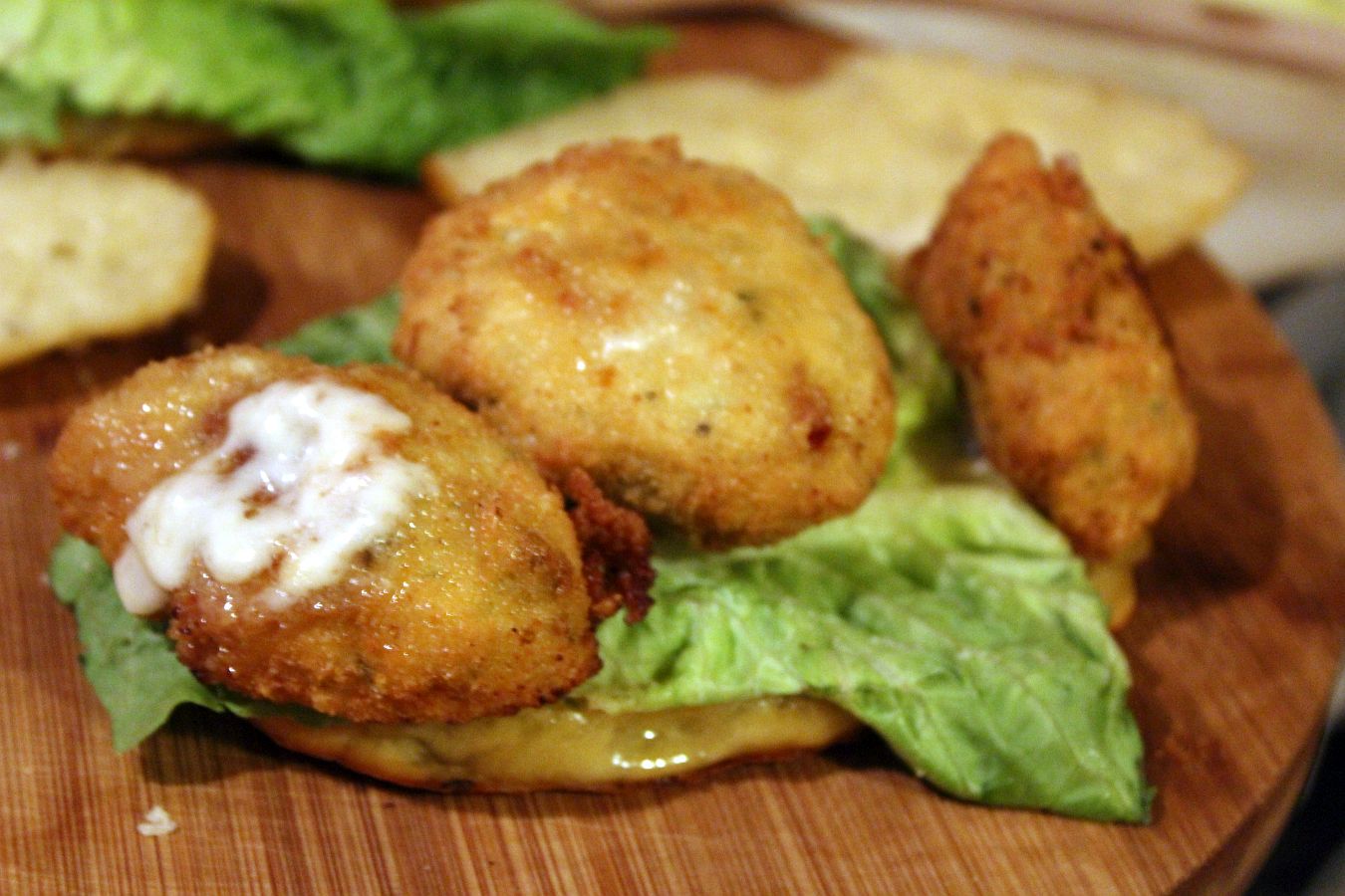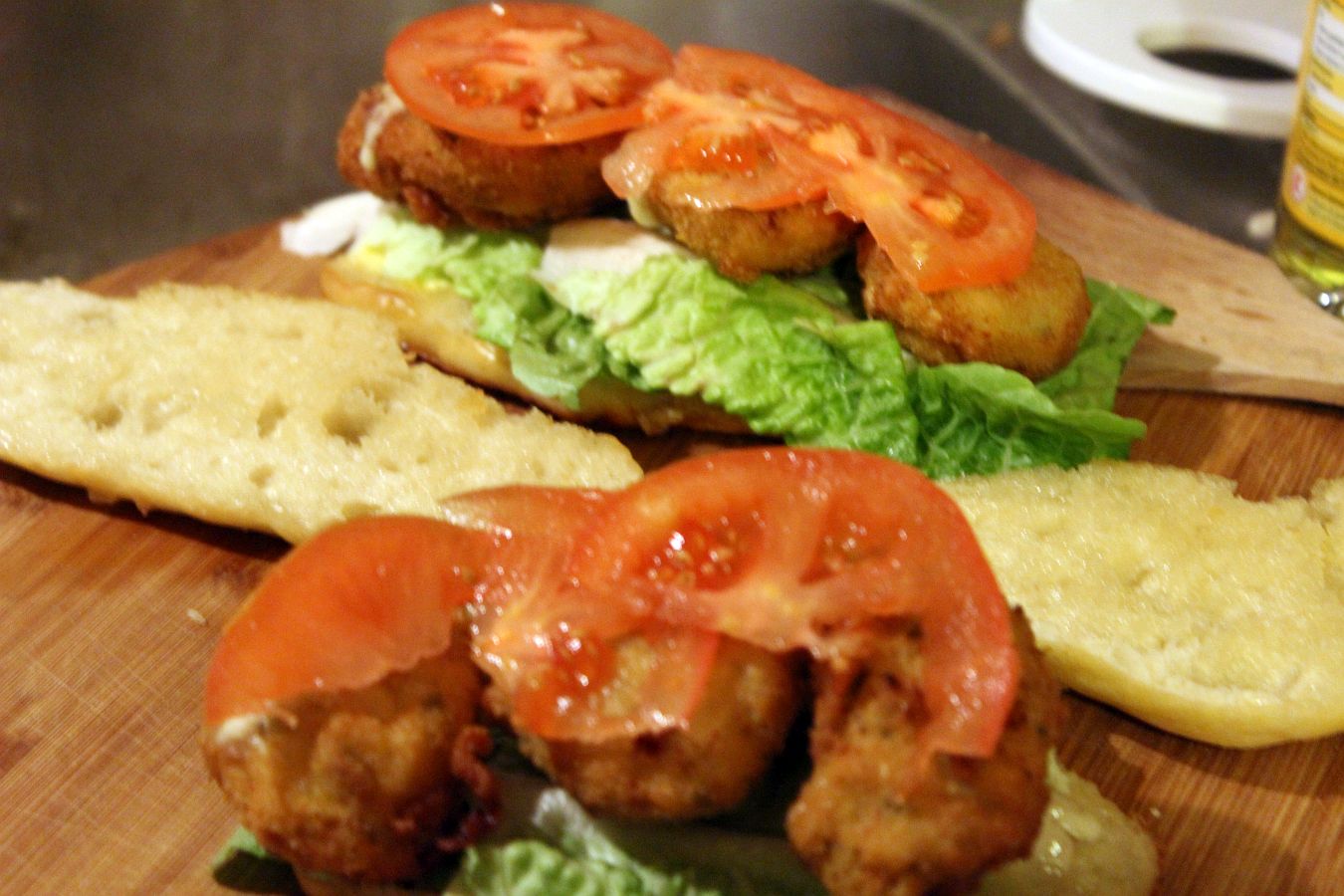 Die Nuggets sind fertig ausgebacken und lagern bei schonenden 70 bis 100 Grad im Ofen, damit sie nicht auskühlen und nicht weiter garen. Nun werden die Sandwichbrötchen vorbereitet.