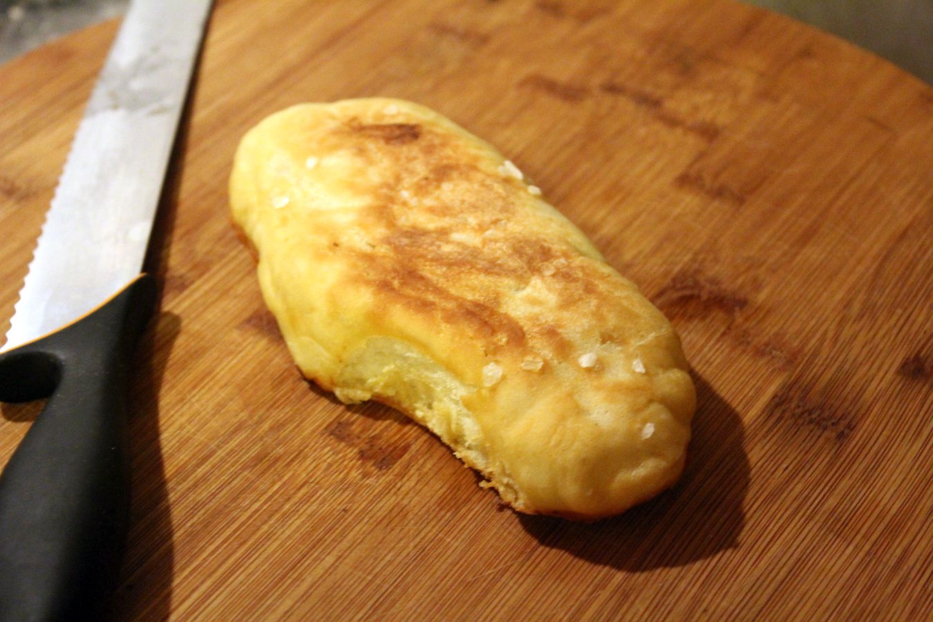 Aufschneiden und mit den Innenseite in einer Pfanne ohne Fett angeröstet, damit sie nicht so schnell von den Soßen durchsuppt werden.