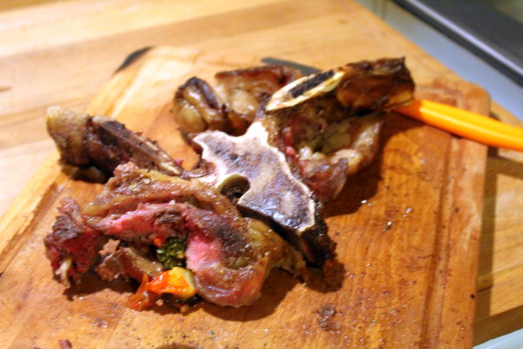 Fleisch vom Knochen trennen. Das sieht schon mal nach einem guten Gargrad aus.