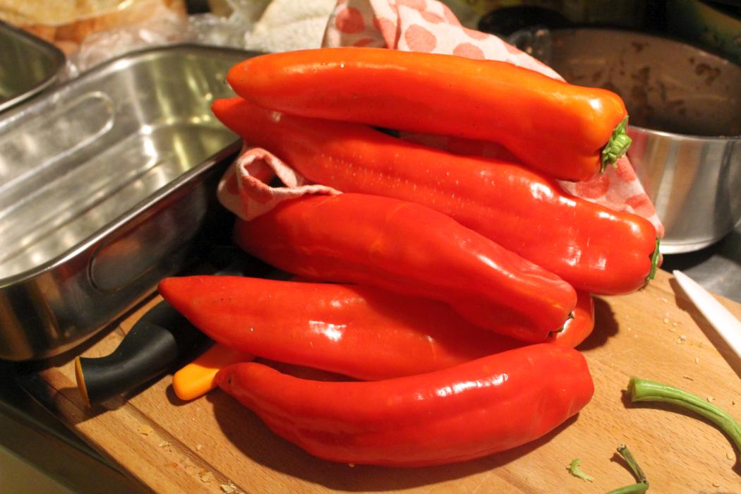 Mein Ofen ist ja doof und hat nur Unterhitze, deswegen braucht der immer länger als ein normaler Ofen. Dafür ist er im Gegenzug ein bisschen schonender beim Garen. Ich brauche für Paprika und Tomaten aber auch zwischen 45 Minuten und einer Stunde, bis da das Wasser raus ist. Ihr solltet 200 Grad nehmen, ich stelle den Gasofen zwischen Stufe 5 und 6 ein.