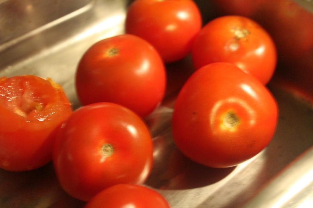 Das sind die Tomaten. Die haben bei Metro 500 Gramm 3,40 Euro gekostet, können also nicht ganz schlecht sein. Kommen aus Italien und schmecken pur schon richtig nach Tomate. Im Prinzip ist das aber egal, wo die Tomaten herkommen und ob Sommer oder Winter ist. Das sind solche Plattitüden wie über das Wetter, dass Tomaten nur im Sommer schmecken, zumindest wenn man die im Ofen reduziert und das Wasser rausdampfen lässt. Jede Tomate hat ganzjährig 2 Gramm Zuckergehalt, egal ob sie groß oder klein ist. Deswegen schmecken kleine Tomaten meistens besser als große, weil sich da weniger Masse, auf die gleiche Menge Zucker konzentriert.