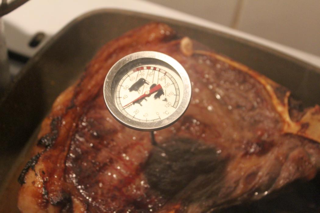 Da ich nicht jeden Tag so einen Trümmer in der Pfanne zubereite, benutze ich schon in der Pfanne, gegen Ende der Garzeit in der Pfanne mein Kernthermometer, um eine Einschätzung zu bekommen, wie weit das Steak gegart ist und um eine Idee zu bekommen, wie lange ich noch im Ofen beim Nachgaren brauche. Wie gesagt, ich habe da nur Unterhitze, der Rest der Welt hat ja Ober- und Unterhitze. Nach insgesamt 16 Minuten auf dem Herd, gebe ich dem Fleisch noch einmal 20 Minuten im Ofen.