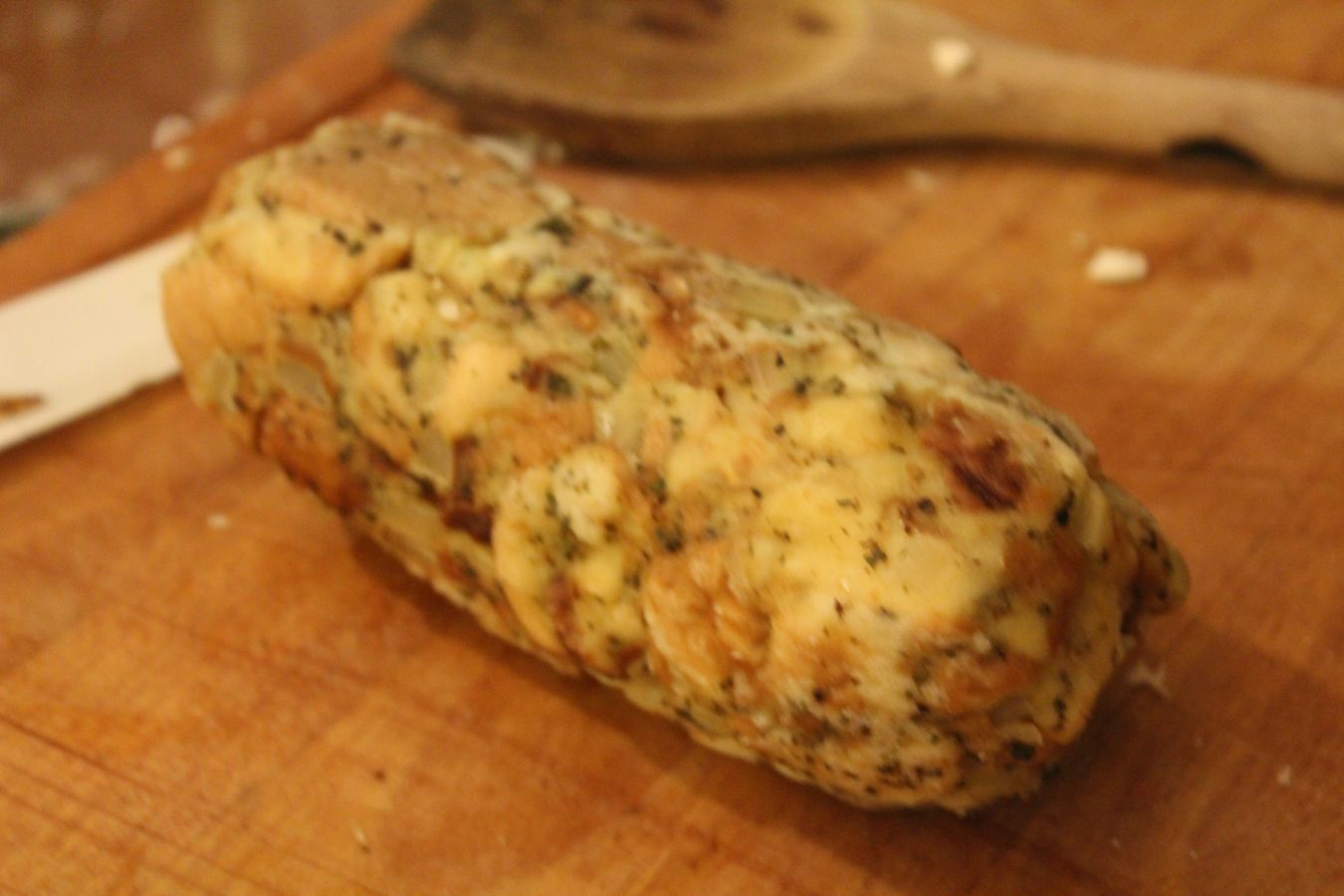 Zwiebeln und Knoblauch zum Brot geben