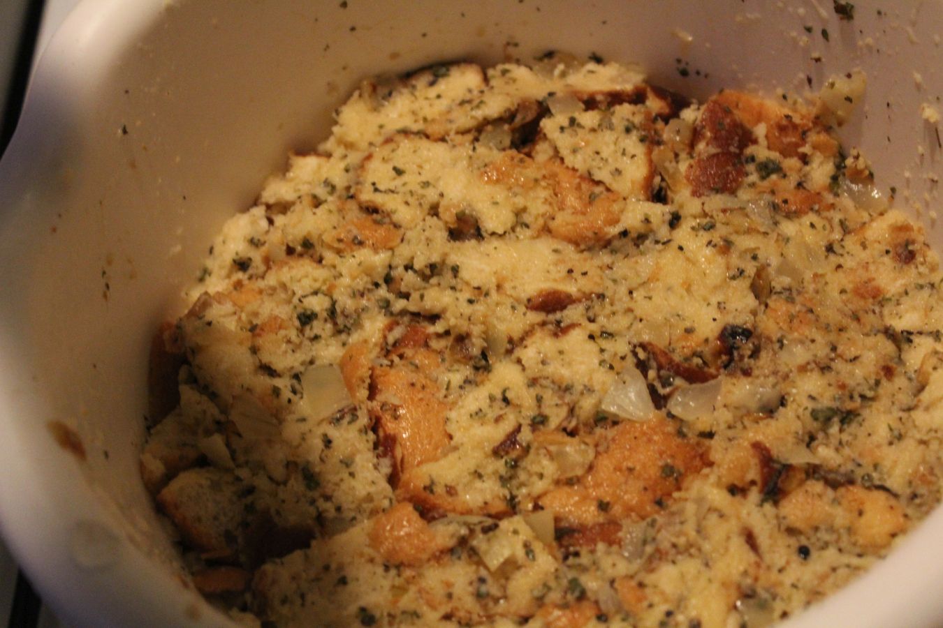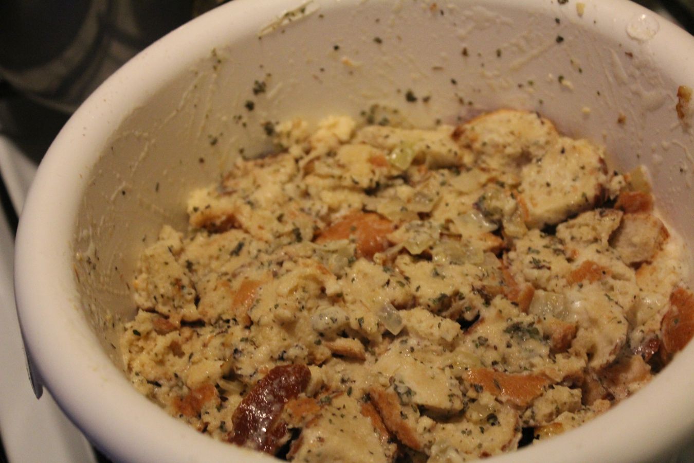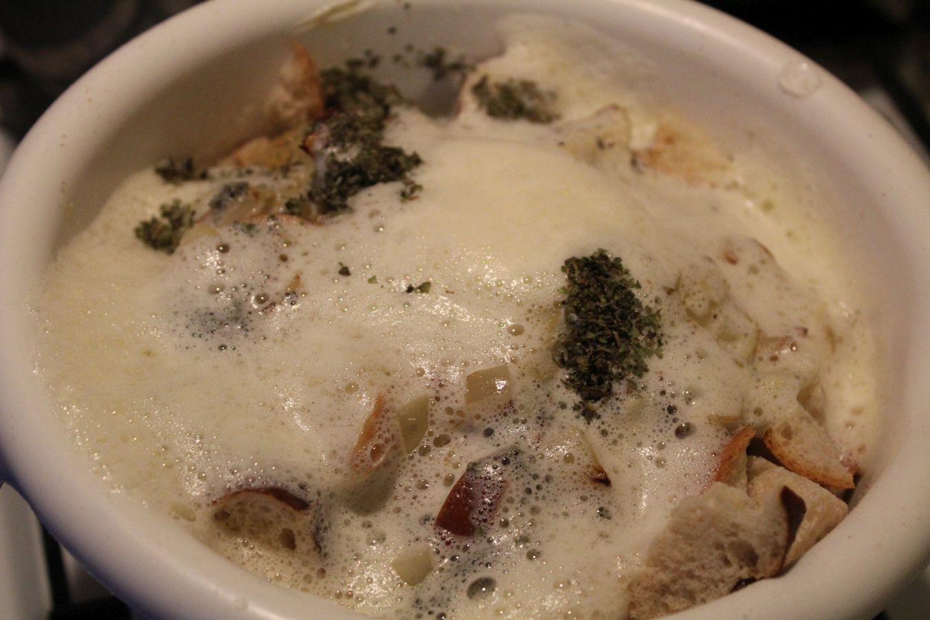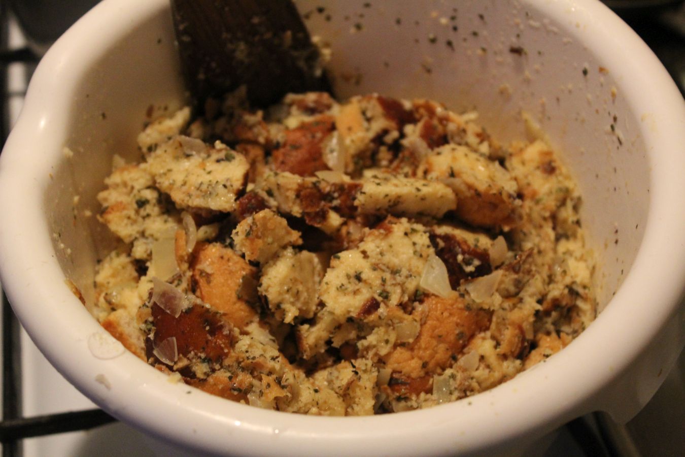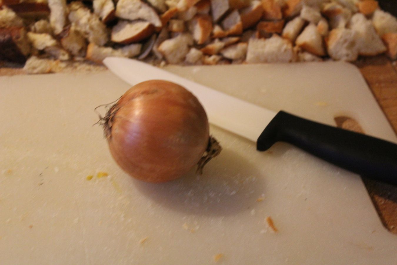 Brötchen zerkleinern. Eigentlich sollen die vom Vortag sein. Meine waren nicht aus der Vorwoche, aber auch schon deutlich älter als einen Tag. Ist aber egal, da muss man beim Zerkleinern nur mehr Kraft aufbringen,