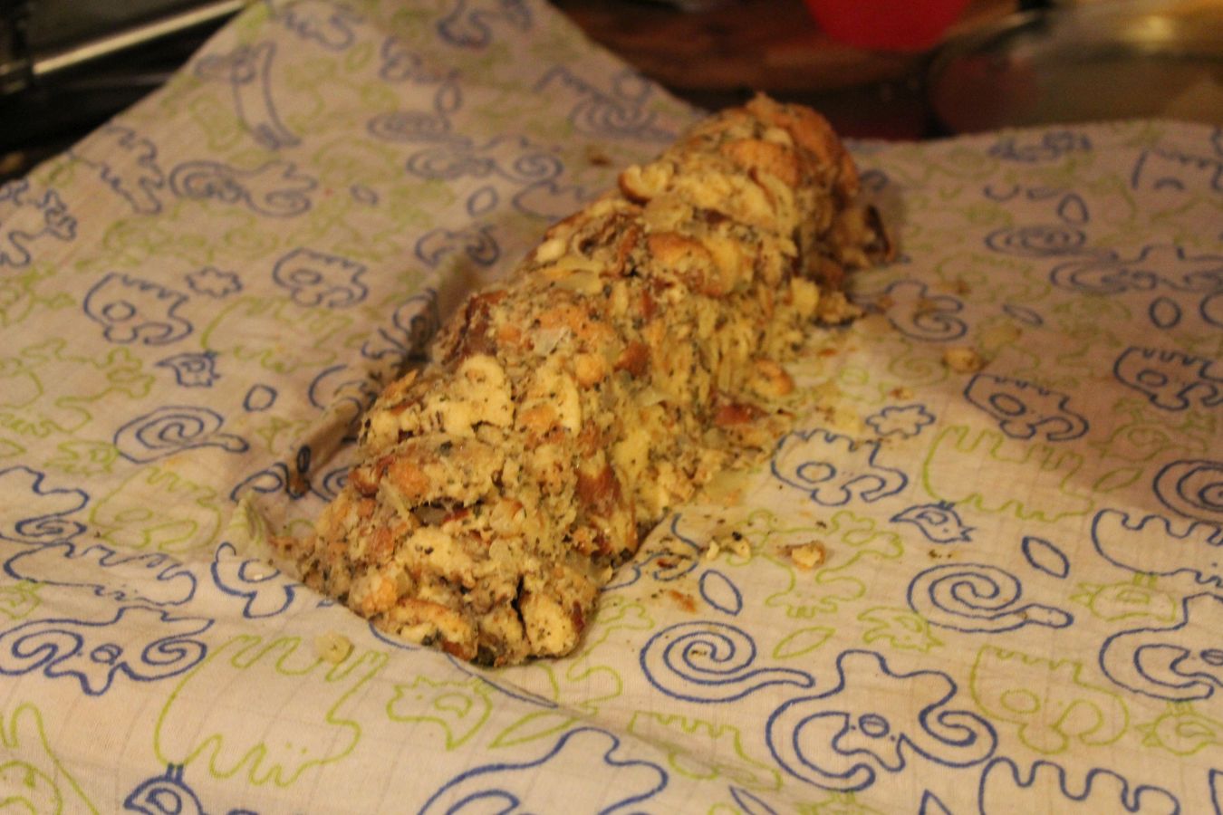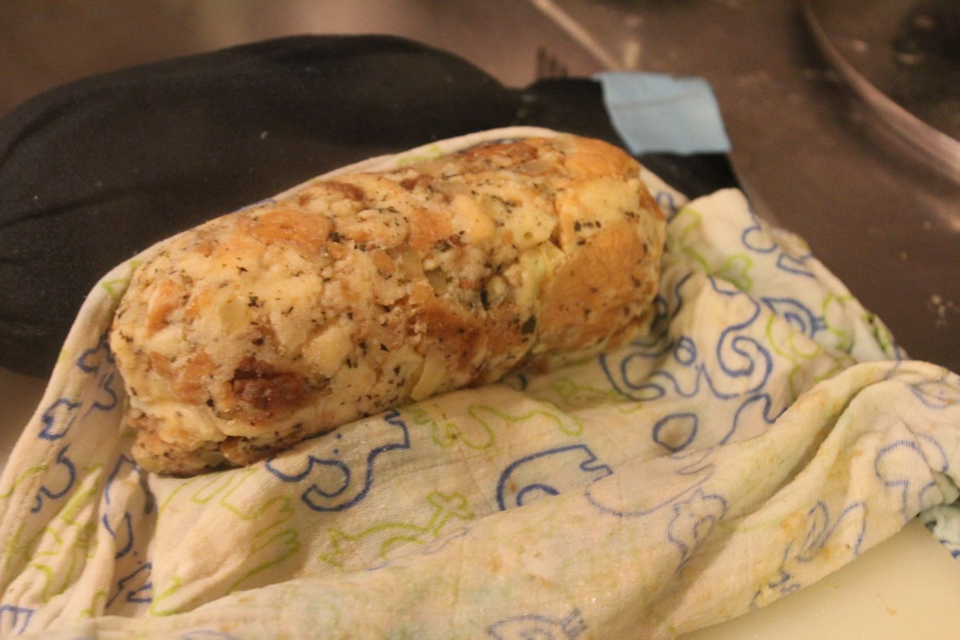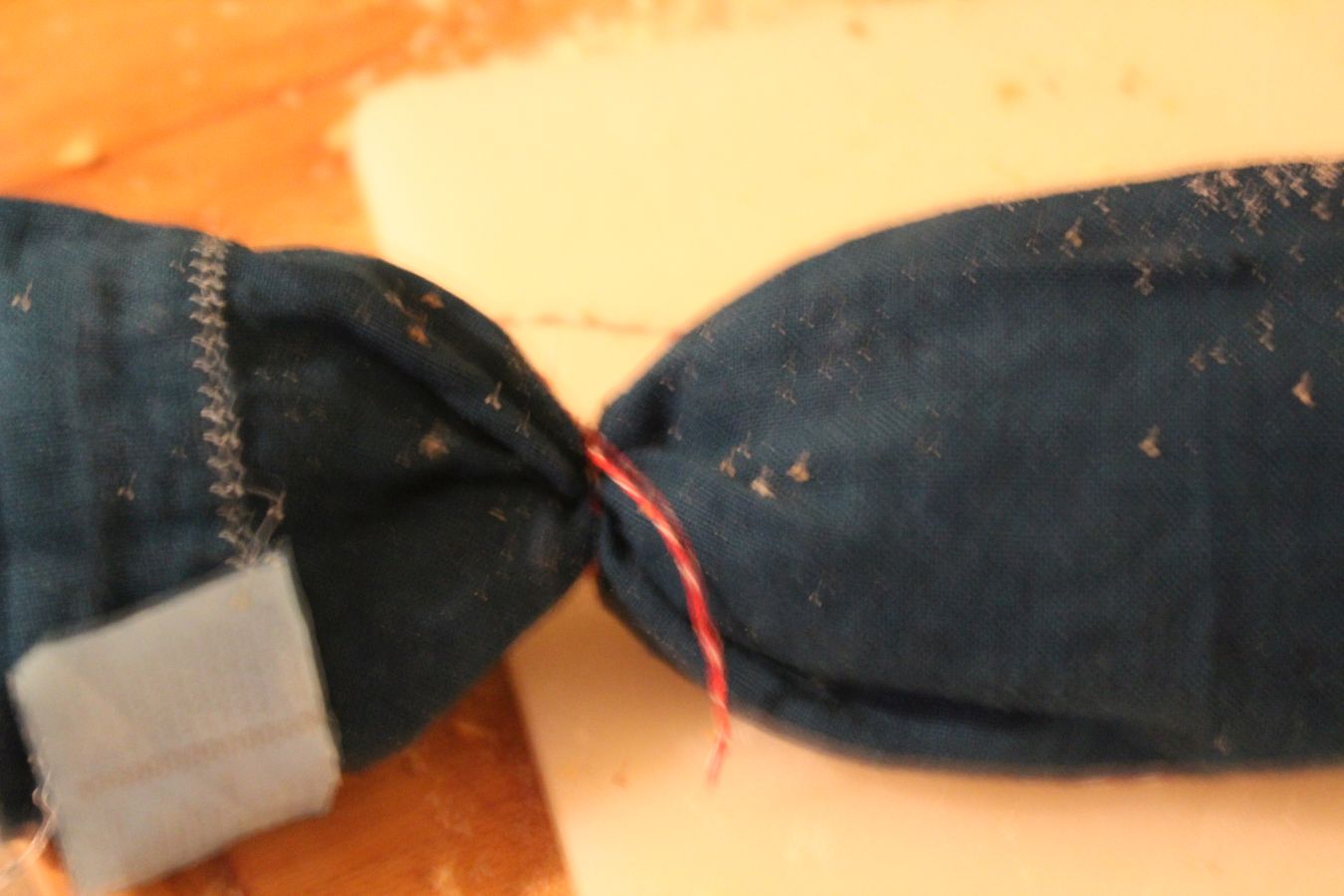 Ich habe dann festgestellt, dass die Wurst zu lang für meine Töpfe ist, also habe ich das noch einmal auf zwei Tücher verteilt
