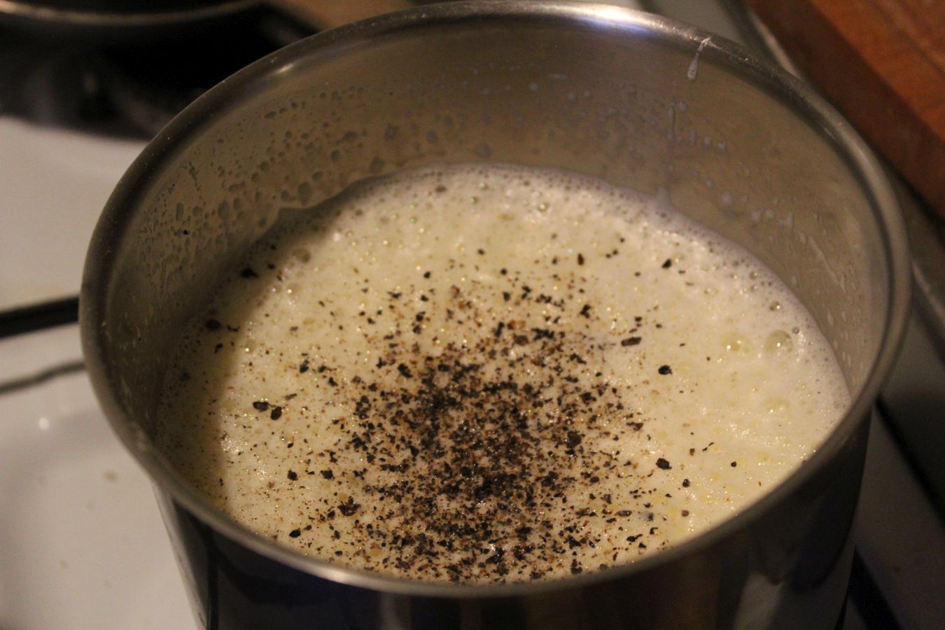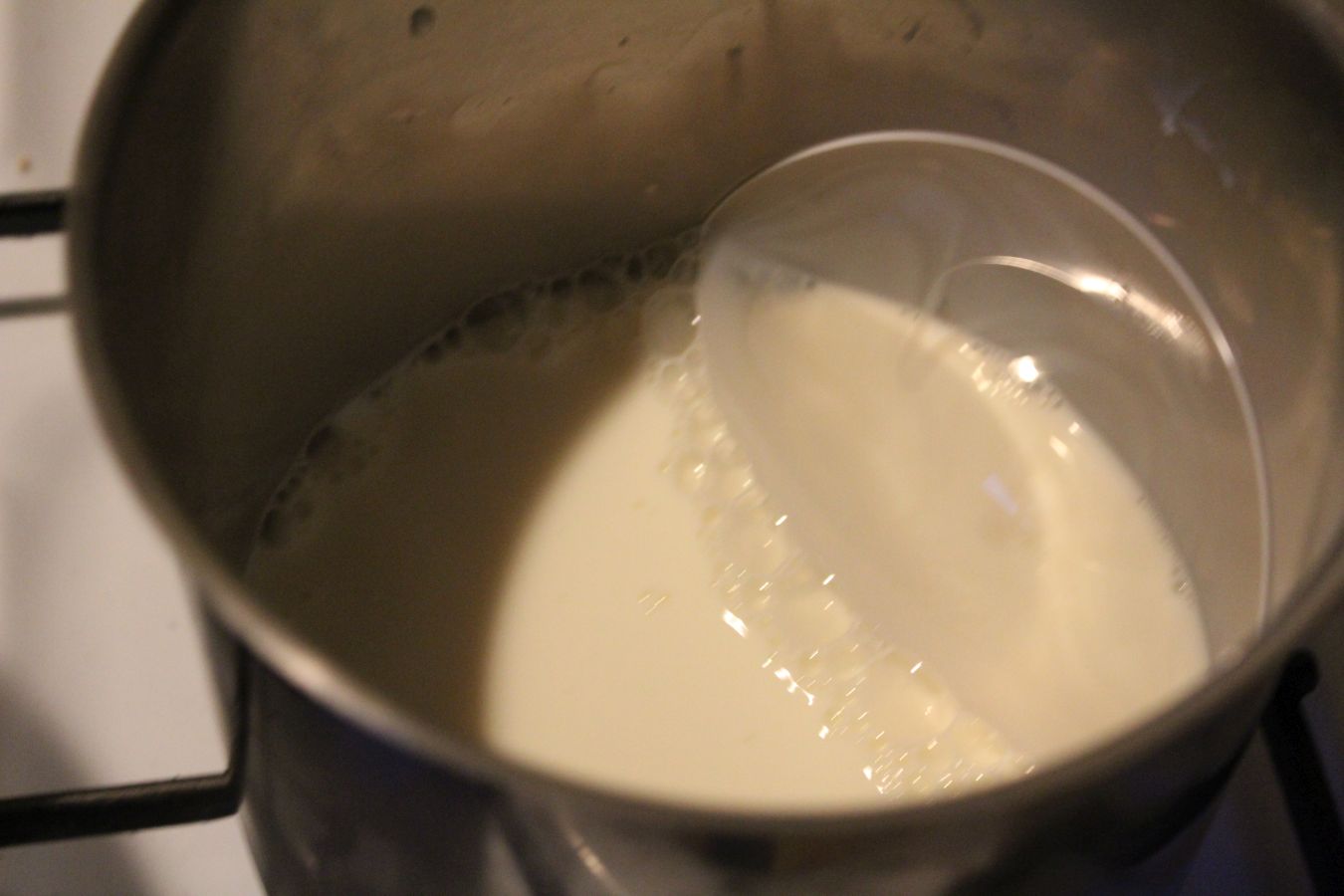 400 Milliter Milch in einen Topf geben und anwärmen, nicht über 70 Grad gehen